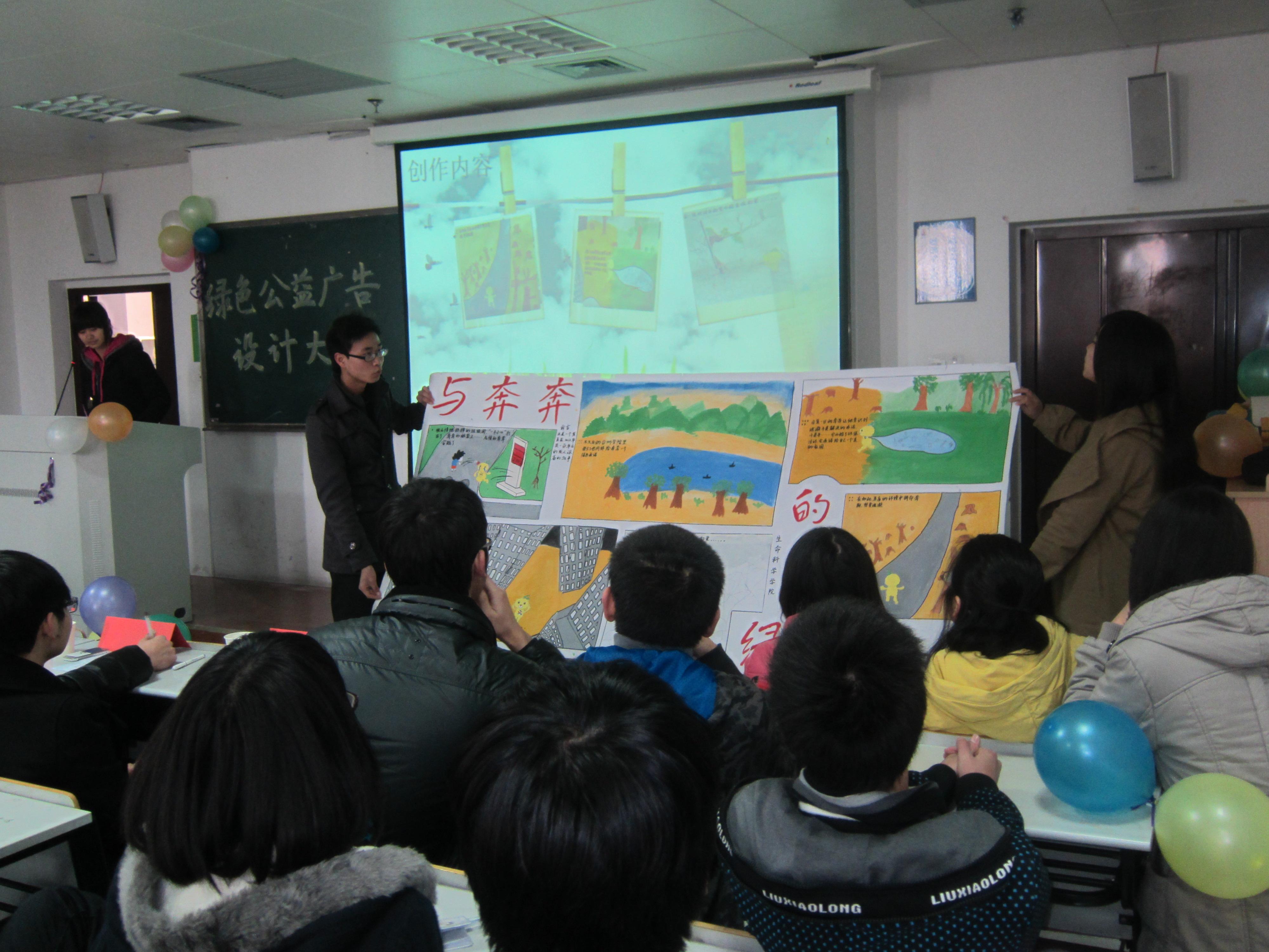 本次大赛得到了同学们的积极响应,经过初赛的激烈角逐,共有10组作品脱颖而出,晋级决赛。决赛现场,每一组作品都独具匠心,大胆创新,精彩纷呈,倡导环保的公益海报、珍爱生命的电子刊物……一件件都是智慧和创新的结晶。广告设计作品创意涉及教育、贫困、环境等多个领域,新颖独特的作品,展示特色的PPT,绘声绘色的解说,纷纷展现出同学们的设计理念、编排布局、独特创新。最后,2011级生物工程专业黄莹、徐褚灵组合的作品《关爱生命,传承文明》凭借其崭新的视角,独到的设计,精彩的展示,以97.3的高分摘得桂冠。
