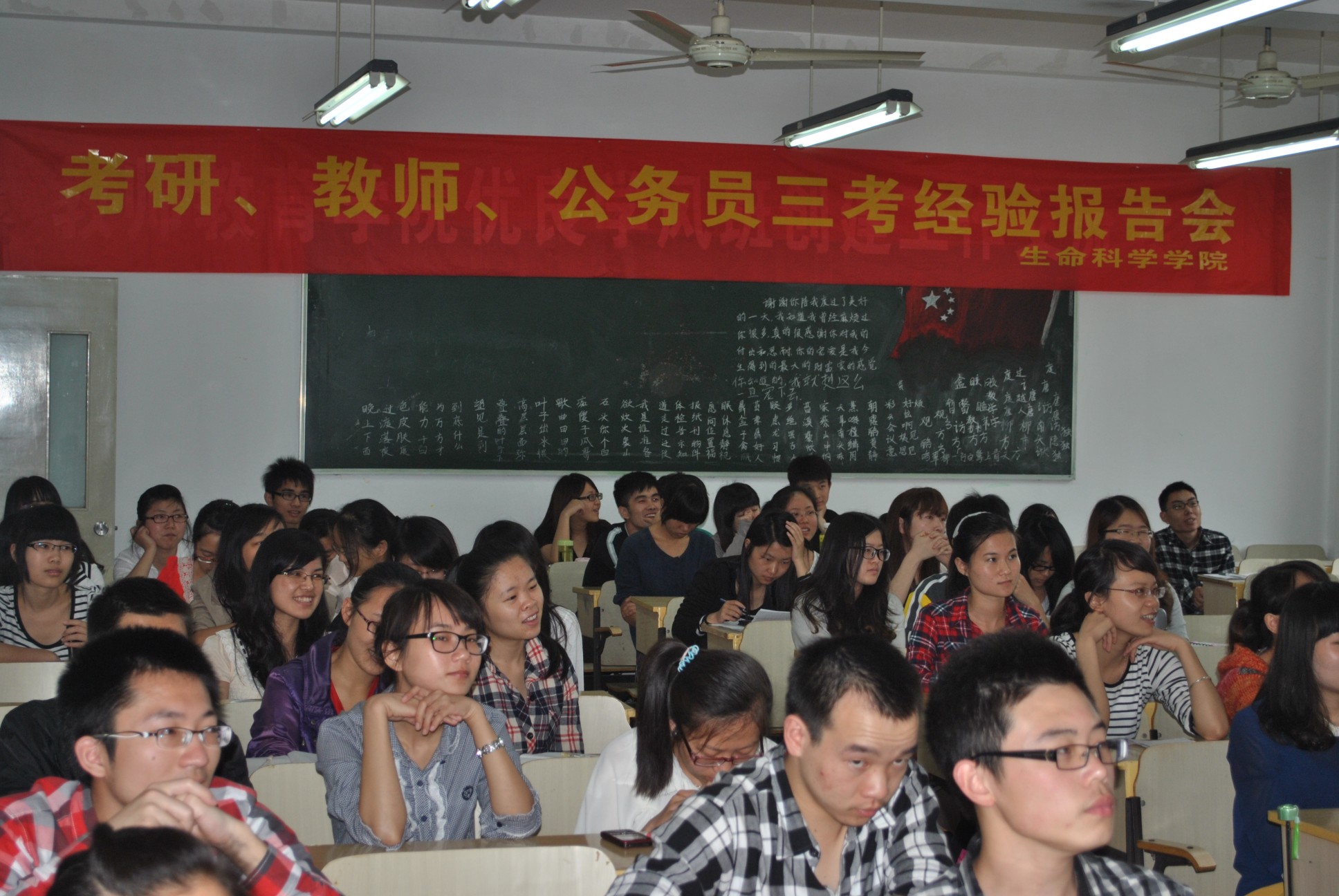 为使大学生能更充分地了解时下考研就业形势、公务员招考情况和教师招聘考试进展,让同学们对“三考”情况有个更具体的认知,帮助他们更好地确立未来的奋斗目标。5月26日下午,生命科学学院为期两周的“三考”经验报告会圆满落下帷幕。储柳丹等10位优秀08级同学应邀作为本次活动主讲人。