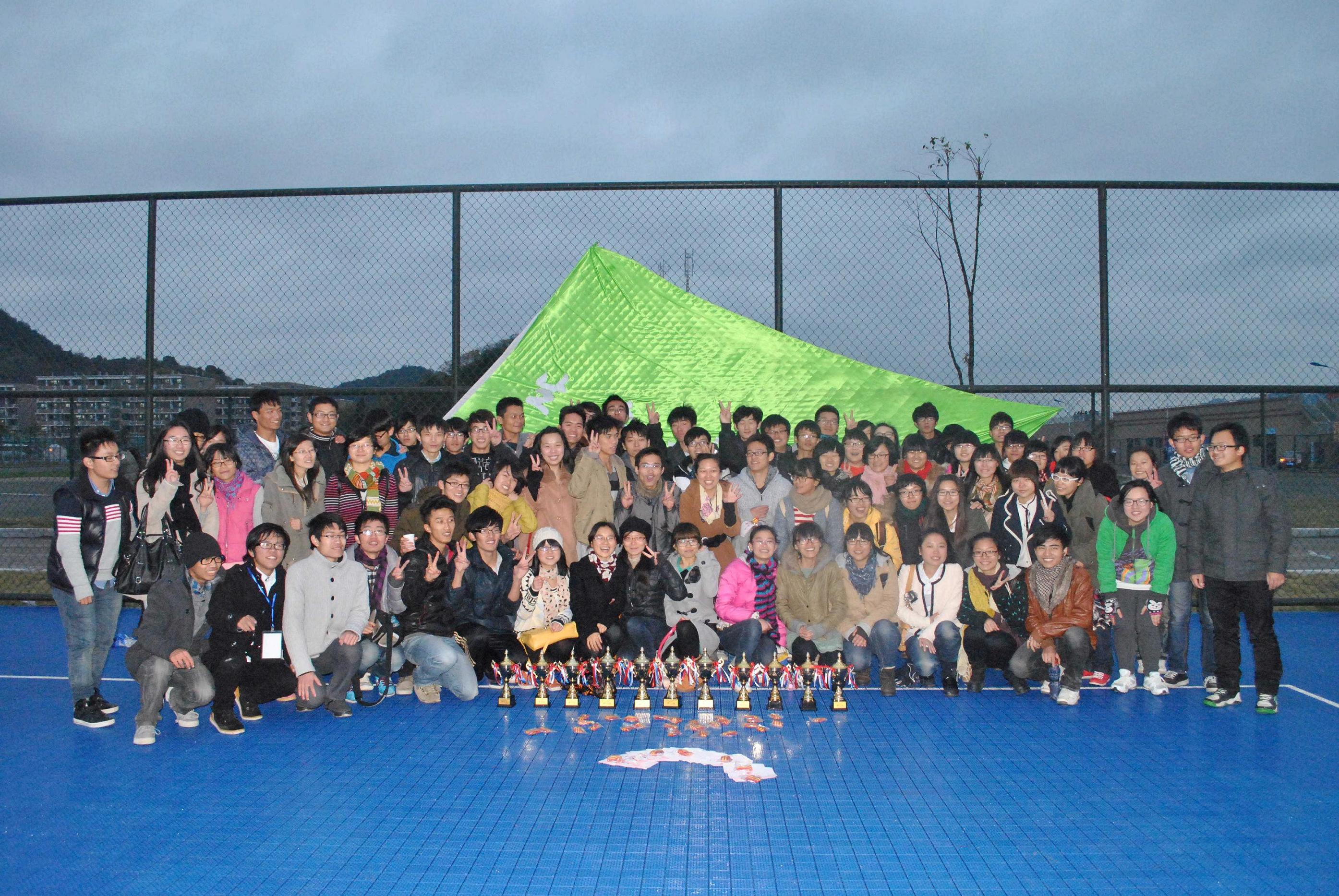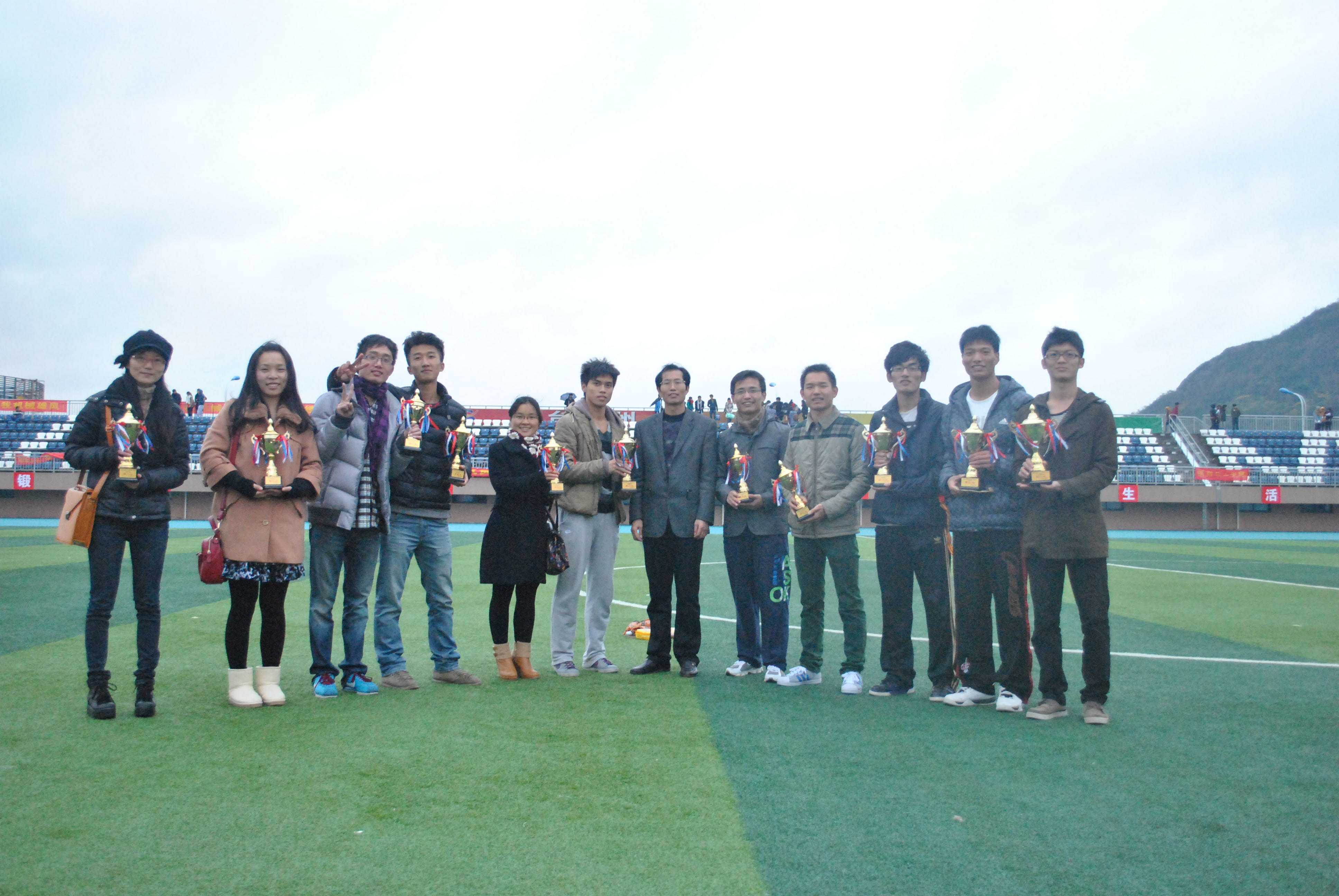 本次运动会中,生命科学学院代表队由教工组和学生组组成,其中学生组分为4个年级代表队,共有66位学生运动健儿,各项赛事都有我们生命的矫健身影。三天的运动会中,生命健儿们把一滴滴汗水挥洒在绿茵场上,把一个个荣誉记录在奖牌榜上,把一份份爱心传递在服务点上。比赛结束后,生命科学学院获得总分团体第二,各项奖杯11座,有32人次登上冠军的领奖台,总计获得奖牌数32块,其中甲组朱晓玲同学一举荣获5000米、3000米、4×100米接力、4×400米接力、三人60米竞速5项冠军, 另有钟俞丹、徐平、陶丹凤等分别荣获多项冠军。丙组孔庆娜老师勇夺女子跳高金牌,蒋明、管铭、廖运平、翁添富等老师均获得奖牌。
