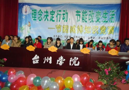 此次活动共分为节能减排宣传和环保知识竞赛两个项目。11月24号,协会成员在临海崇和门广场设点宣传,邀请过往行人观看宣传展板并在横幅上签名,还向行人发放由学校后勤处提供的节能环保宣传册和DVD等,通过协会理事及干事们的共同努力,现场行人络绎不绝,气氛十分活跃,俨然成了一道的亮丽风景线。12月6号下午2点,由各二级学院组建的15支代表队在椒江校区3207进行环保知识的比拼。比赛分快速回答、风险题、抢答题三个环节,经过前两轮的淘汰选拔,十支队伍进入了最后一轮的角逐。末轮的抢答赛更是高潮迭起,选手们的精彩表现赢得了应邀嘉宾及现场观众的阵阵掌声。最终生命学院代表队凭借出色的表现获得了一等奖,到场的嘉宾为获奖队伍颁发了证书,这些证书不仅是他们的辛勤努力的结果,更代表了他们对“低碳环保”事业的热爱与推崇。