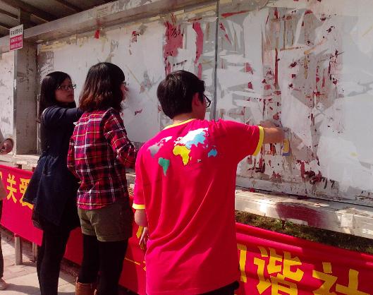 为确保整个活动的顺利进行,各个协会的负责人将人员分成两批,一批负责清除校内牛皮癣,另一批则负责回收废旧衣物。活动开始后,成员们积极参与活动,一批成员用小刀、铲子、抹布等工具,对寝室楼下的宣传栏上随意张贴的小广告进行全面清除。同时,另一批人在食堂门口进行设点,回收废旧衣物,并邀请捐赠者书写对于衣物获赠者的祝福话语,传递爱的鼓励。在经过2个多小时的努力工作之后,“学雷锋”活动圆满完成。