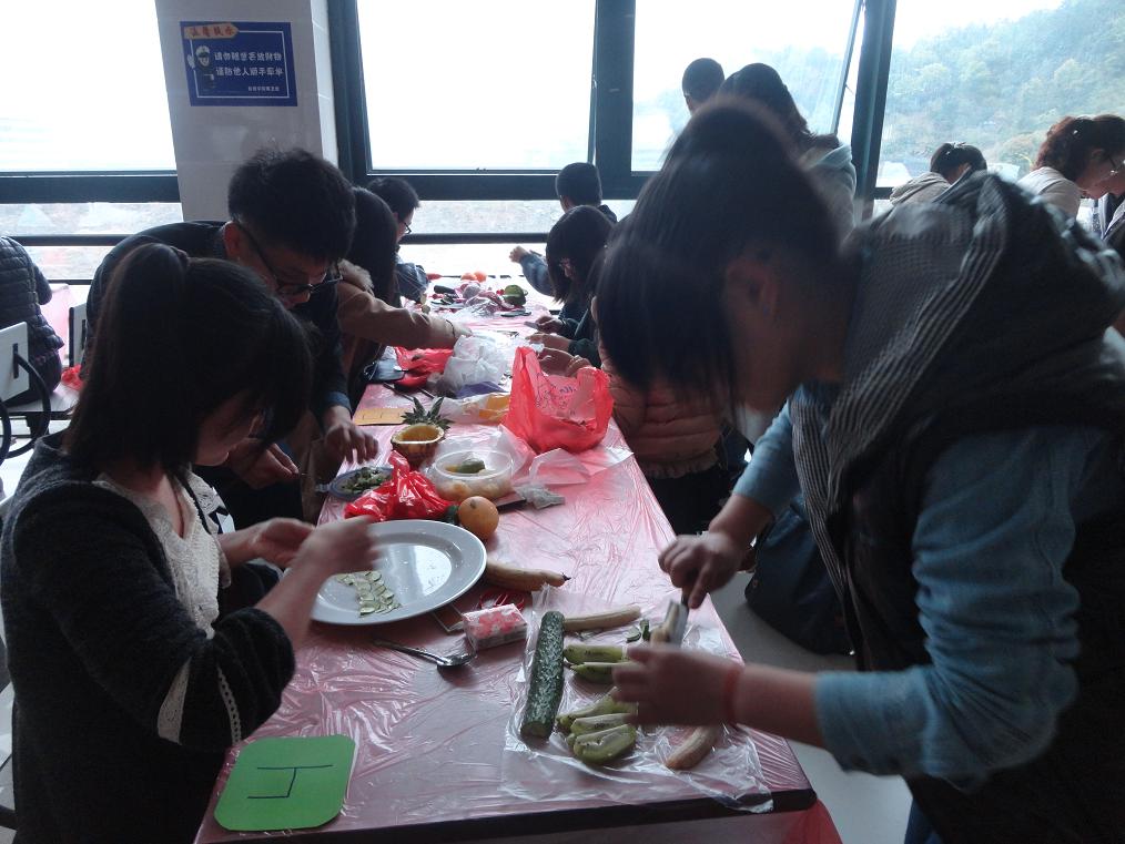 比赛由水果拼盘和厨艺大赛两个环节组成。水果拼盘共有16组选手参加比赛,每组选手积极开动脑筋,群策群力,在有限时间和限量水果的条件下,通过团队合作,赋予了作品无限的生命力。精美绝伦的绣花雕刻,美观合理的色彩搭配,层出不穷的创意拼盘,让评委们啧啧称奇。最终由11生物教育徐婷婷等同学带来的“绽放”一举夺得头筹。