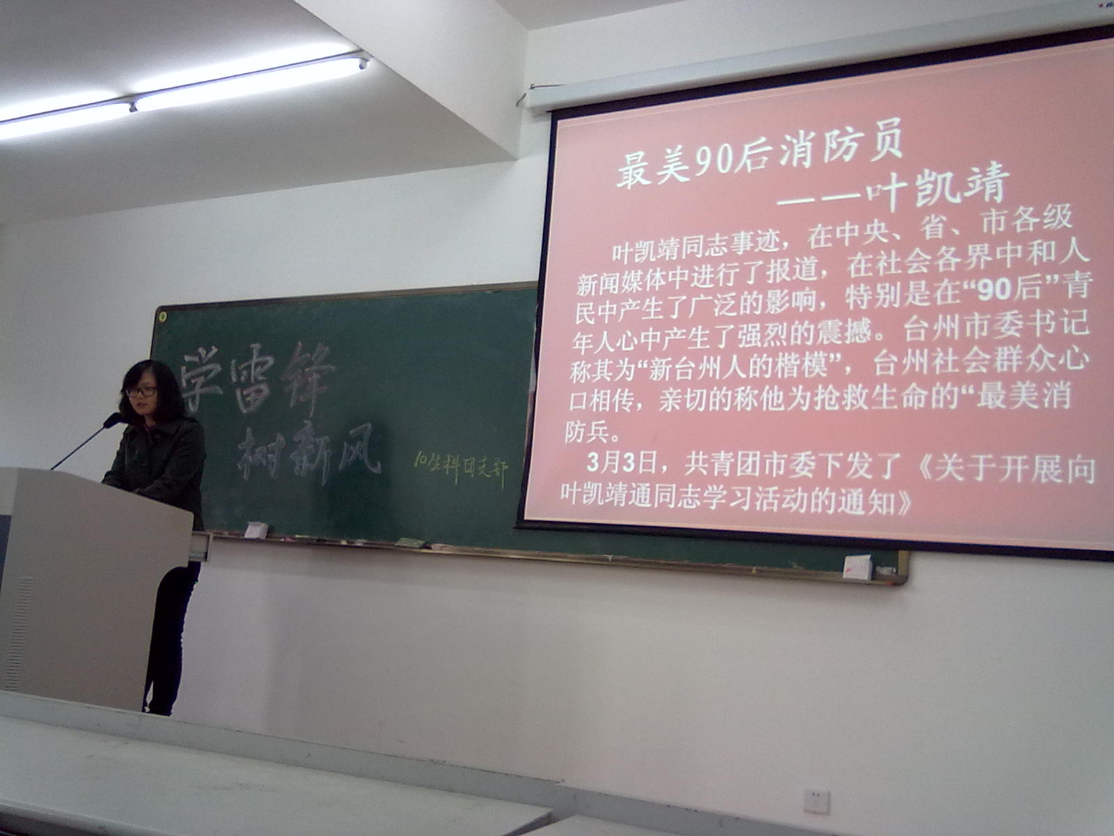 3月初,生命科学学院分团委在校团委的号召下,带领学院各团支部开展了形式多样的主题团日活动。院内各团支部则通过网络资源,搜找查阅相关资料,以支部共青团员为依托开展了“叶凯靖同志先进事迹”报告会、“如何向叶凯靖同志学习”研讨会、“争做最美浙江青年”座谈会等广大同学喜闻乐见的主题团日活动,并借助各班级团支部的新浪博客、腾讯微博等网络平台进行广泛学习、宣传和交流,在院内迅速掀起了向“最美消防兵”叶凯靖同志学习的热潮。