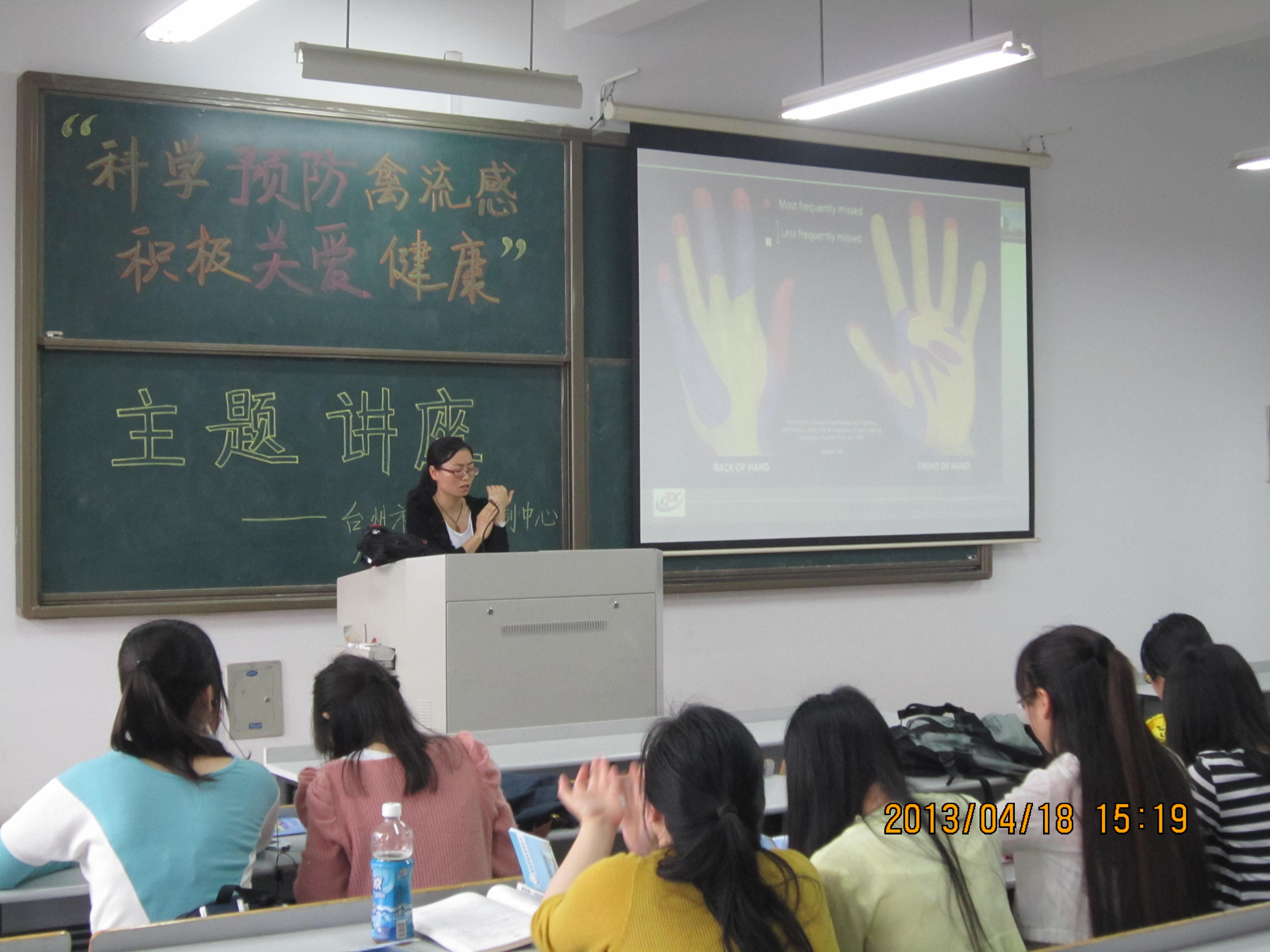 为进一步加强学生对H7N9禽流感病毒的认识,引导学生们形成良好的卫生习惯,4月18日下午,生命科学学院人类自然协会携手台州市疾病控制中心在椒江校区3-408举办“科学预防禽流感,积极关爱健康”主题讲座。疾控中心胡雅飞医师应邀担任主讲人。