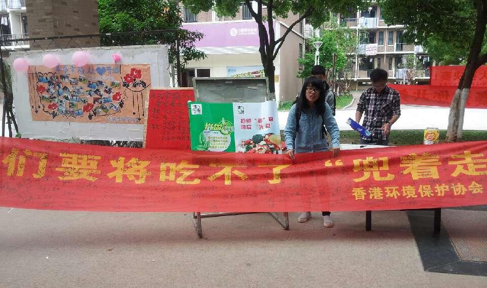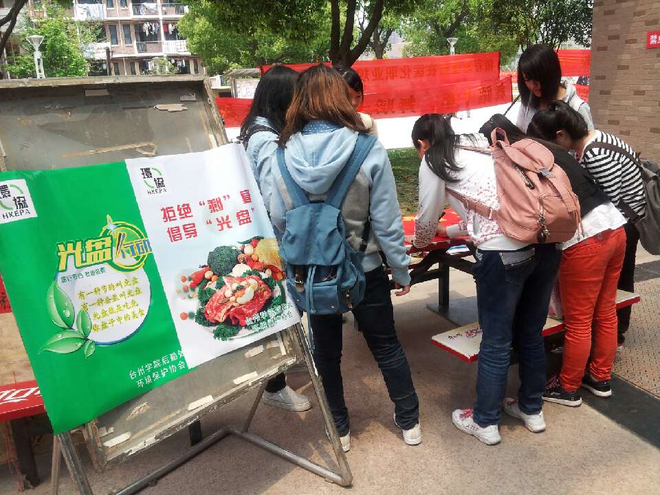 为积极响应十八大“勤俭节约”的倡导,创建文明校园,提高大学生的综合文明素质,生命科学学院环境保护协会承办了由香港环境保护协会主办的首届全国高校光盘行动,于4月22日、23日在椒江校区开展以“拒绝剩菜,倡导光盘”为主题的光盘行动。