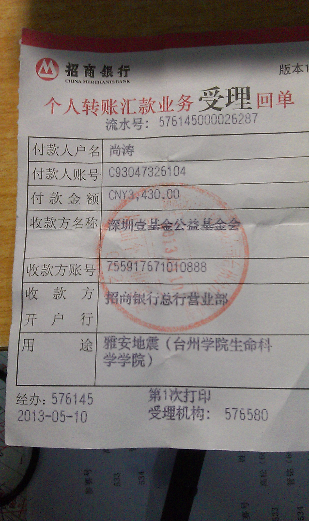 本次募捐活动共筹集爱心捐助3430元。5月10日,学院志愿者队经招商银行将善款汇入深圳壹基金公益基金会。一份爱心,一份支持,绵薄之力,大爱无疆。祝福雅安人民早日走出困境,重建美好家园。
