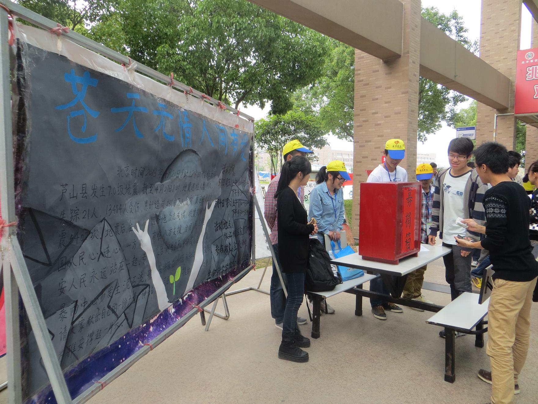北京时间2013年4月20日8时02分四川省雅安市芦山县(北纬30.3,东经103.0)发生7.0级地震。地震后,全国各地众志成城,抗震救灾。5月3日上午,生命科学学院志愿者队在学院分团委的号召下组织开展了为期一周的募捐活动。