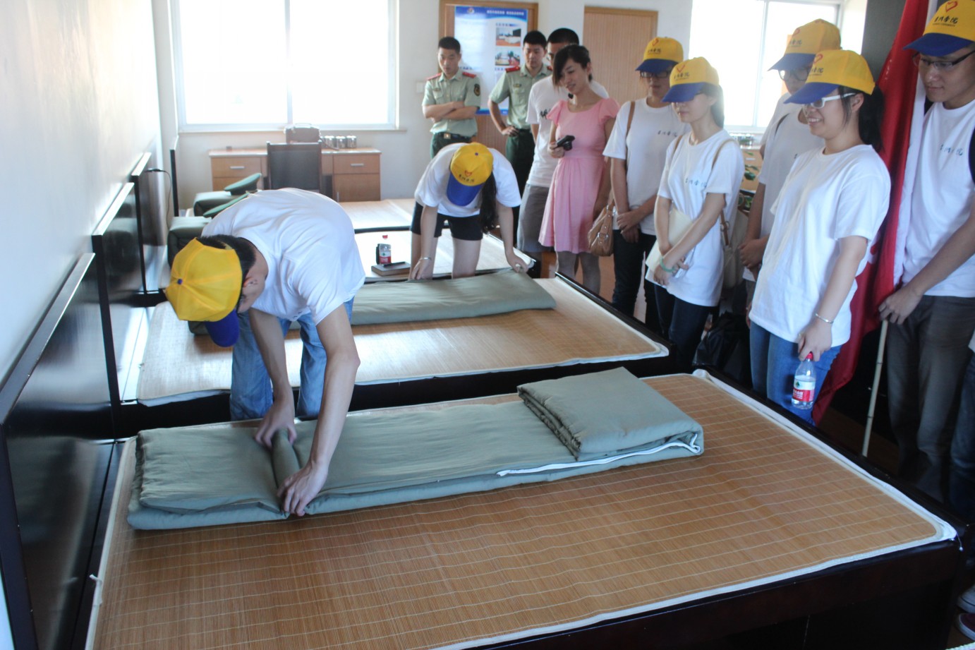 到达边检站的时候,执勤官兵早已守卫在边检一线开始例行工作,负责接待的高排长带领着实践队员们来到了空荡荡的军营宿舍,一排排被称为“豆腐块”的被子,整齐划一的摆放在床头,地面整洁干净不留一个死角。队员们好奇的眼神下,王班长向大家展示了“豆腐块”制造过程,并对整个过程做逐一讲解,看着满头大汗的王班长,队员们更是露出了些许诧异,然而当实践队员亲身经历这一过程,看着“四不像”的被子,无不惊呼“真的好吃力啊!”此时的王班长只是简单的回道“叠被子,三分叠,七分磨,它磨的是你的意志,是磨的你的心性。”一语道尽内涵,无不让在场队员深思自省。
