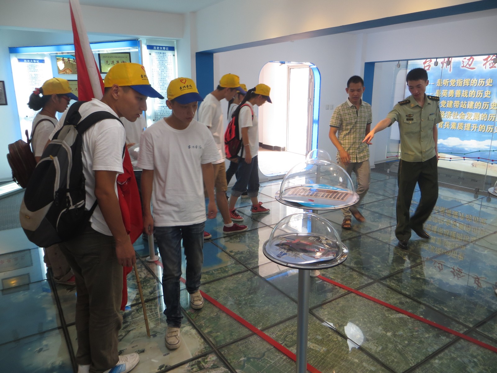走进太空舱造型的室内,首先映入眼球的便是地上的一个大圆盘。圆盘中间展示着台州边检站的站徽,一男一女两名官兵站在航船之尖,扬起手臂,乘风破浪,并构成了“T”、“Z”字样,代表了台州边检站工作职责,也寄予未来勇攀高峰的期望。站徽右边,一艘艘航模依次摆放于橱窗之中,精致细腻的设计与组装,让实践队员们惊叹不已;左边,边防精神、中国精神,图文并茂展示在眼前,深受感触。台州市GDP增长与台州港发展关系图清晰地展现在我们眼前,曲线起伏,展现了台州市近年来的发展欣欣向荣,也体现了边检官兵们的强烈责任感与使命感。