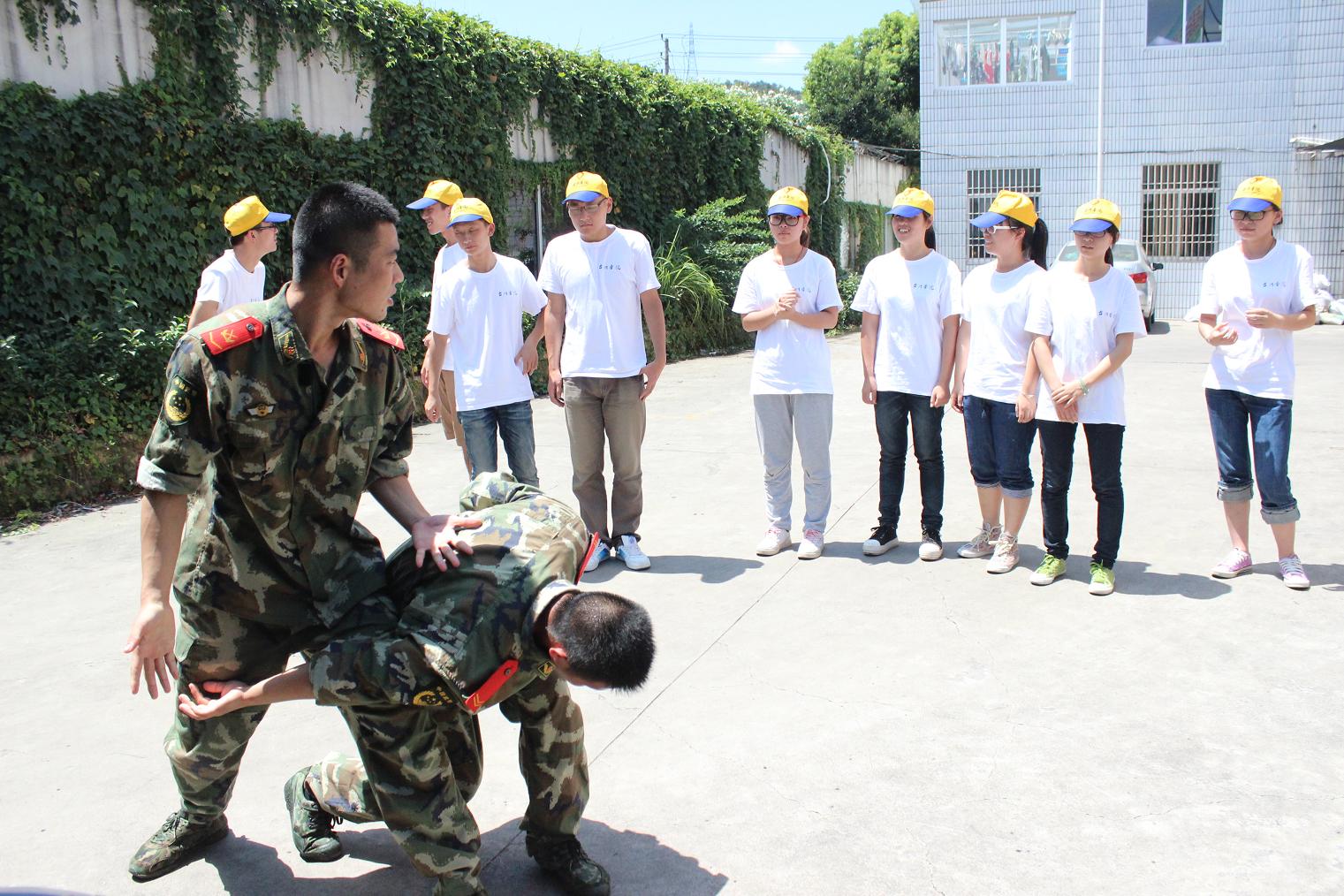 烈日炎炎曝晒,军队是一朵绿花。实践队员们来到训练场地,观看了战士们一套利落干净的擒拿拳,再次沐浴一番军营文化。在王班长教授下,实践队员们学习了一些生活中的防范小技能,不一会的功夫,个个都已是满头大汗,一旁的战士却丝毫不动声色。