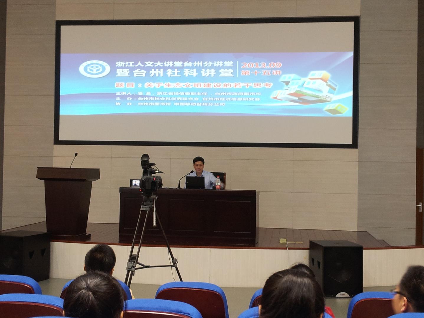 此次讲座邀请到浙江省经委副主任,台州市副市长凌云现场授课,主要围绕生态文明的基本内涵和主要特征展开,分别从推进生态文明建设的重点任务和保障措施等方面进行讲解,强调加快生态文明建设的重要性和紧迫性。演讲中凌市长用大量实例、图片并结合身边实际,向我们展现了当下环境遭到破坏的许多不文明现象,由此强调推进生态文明建设刻不容缓。讲座内容深入浅出,发人深省。此次讲座还特设提问环节,凌市长用真诚的态度为每一位提问者进行详细解答,并对协会代表提出的问题表示了赞扬。