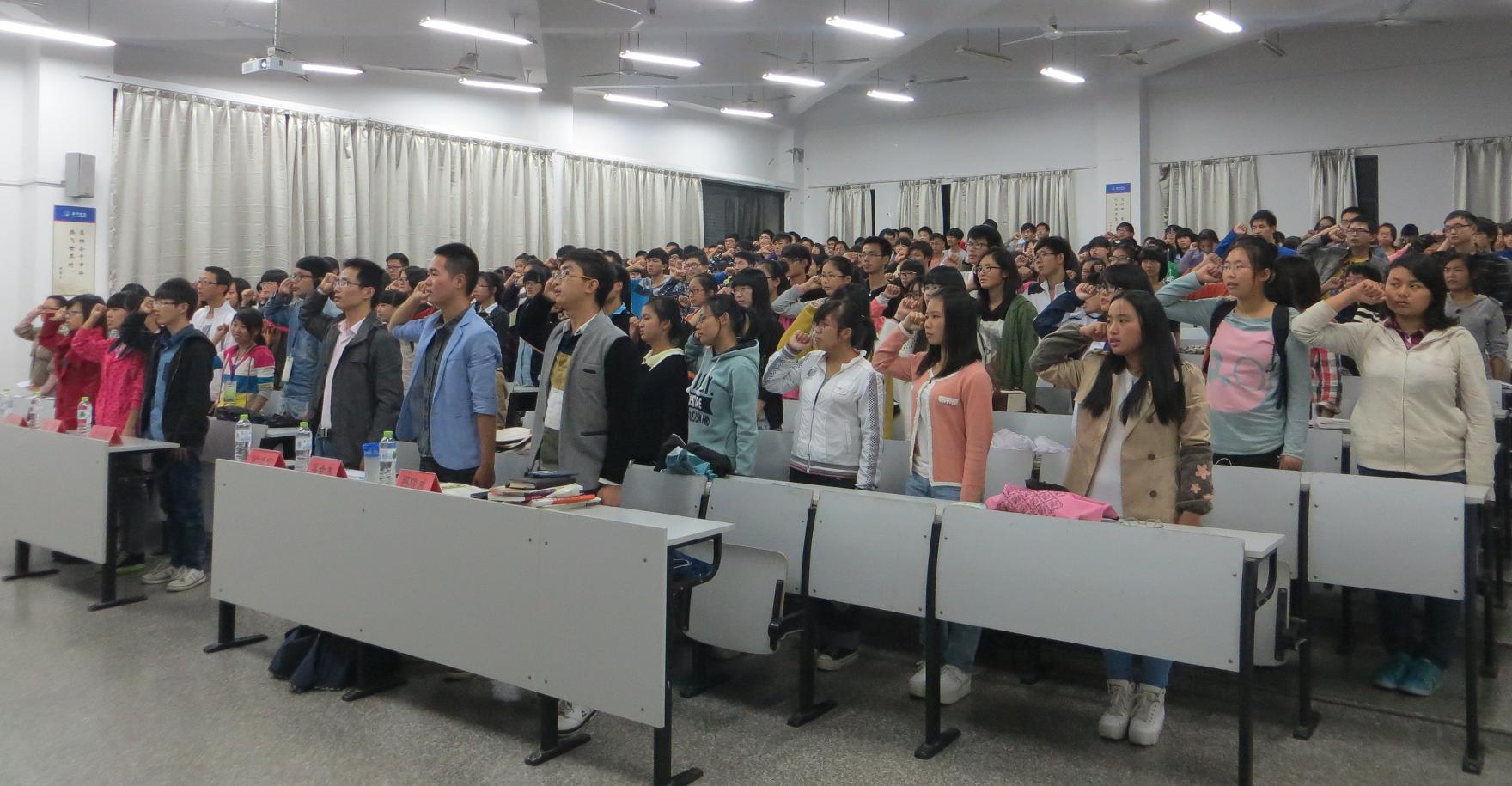 大会伊始,第八届志愿者队队长袁月同学通过播放图片和视频,向志愿者们展示团队历年开展的常规和特色活动,并强调了“志愿者”的概念,加强学生的责任感与使命感。视频中志愿者们一次次无私的奉献,收获的一张张温暖的笑脸,得到的一句句真诚的感谢,是对志愿者精神“奉献、友爱、互助”最贴切的阐述。翁老师则从志愿者队服务理念的不断转变入手,充分肯定以往历届志愿者队的各项工作,尤其是“生命支教”义务支教活动和“一对一”运动会志愿服务工作,并希望团队总结经验教训,进一步完善管理机制,引领志愿者们踏踏实实做事、勤勤恳恳奉献,实现自我价值。作为志愿者代表的冯同学以身作则,用自己的行动去感染别人,用端正态度和思想将志愿精神传递出去。最后,大会在全体志愿者庄严肃穆的宣誓中落下帷幕,一句句慷慨激昂的誓词,一个个牢牢握紧的拳头,一双双坚定不移的眼睛,充分体现同学们对志愿者服务的无限憧憬和满腔热忱。