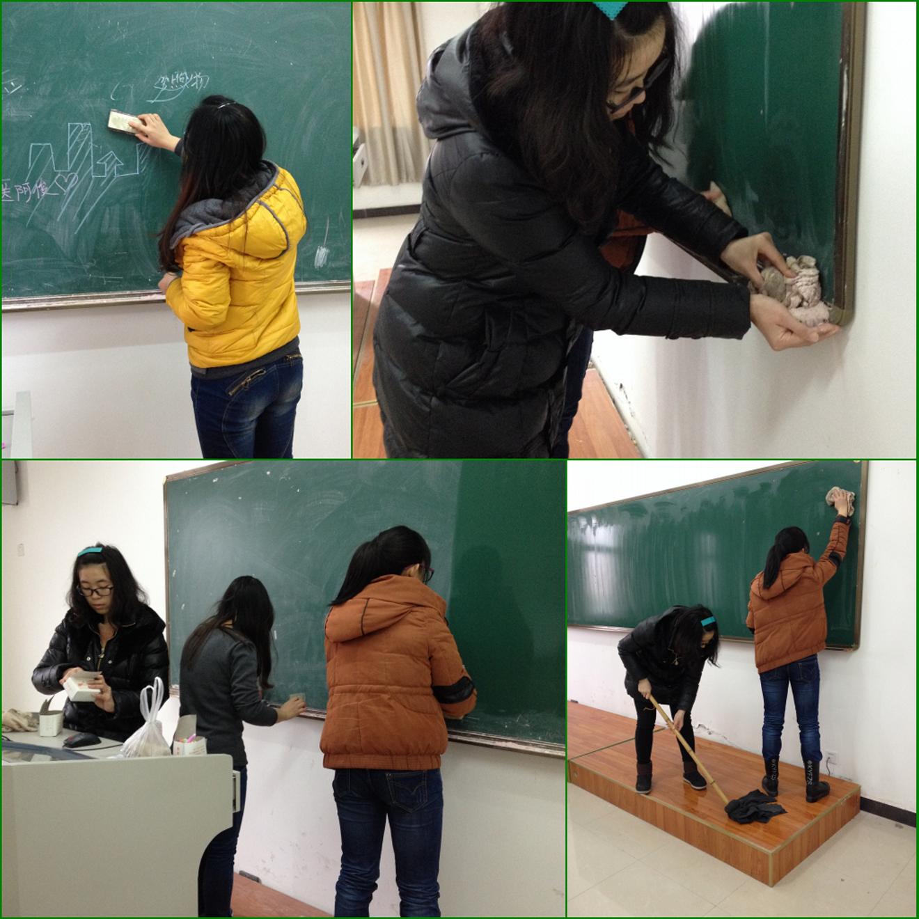 活动共有44名志愿者参与,集中在生命大楼开展,涉及二至五楼的24个教室。志愿者们按分组进入指定教室,用自备的抹布擦洗黑板,对卡槽里久经积攒的粉笔、粉笔灰进行全面清理,并用拖把将地面拖净。之后,志愿者们在每个教室的开关灯处都粘贴了“出门请随手关灯——轻轻一按,节电不难”、“今天,你省电了没?”的温馨提醒,为节能减排奉献绵薄之力。此外,12生物教育班团支部还创造性地开展了“小爱大善,一元筑梦”学雷锋献爱心活动。参与活动的每位志愿者每星期捐出一元钱,集腋成裘,积沙成塔,持续一个月,并将募捐所得款全部用于购买学习用品,为与学院共建社会实践基地的椒江农民工子女学校——博远小学的小朋友们送上温暖。