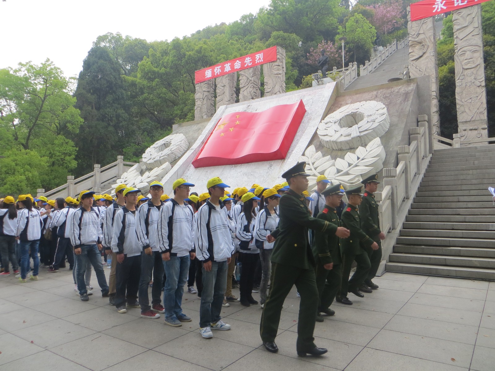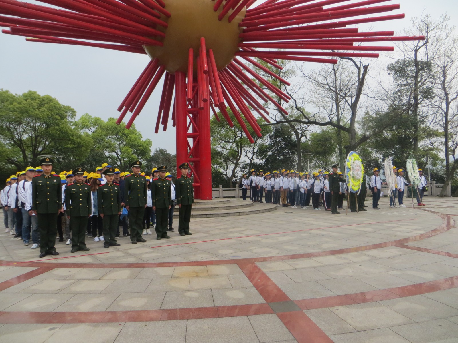 祭扫仪式在庄严的国歌声中拉开序幕,志愿者代表、官兵代表向解放一江山战斗纪念塔敬献花圈,在庄严肃穆的气氛中,全体师生和官兵向革命烈士鞠躬致敬。桃花红雨英雄血,碧海丹霞志士心。解放一江山岛革命烈士陵园长眠着为解放一江山岛英勇捐躯的四百五十四位烈士和其他革命烈士。在“众志成城”、“光照千秋”、“三军丰碑”、“和平昌盛”的群雕和烈士墓前,大学生和官兵们怀着深深的崇敬,献上吐蕊的康乃馨。