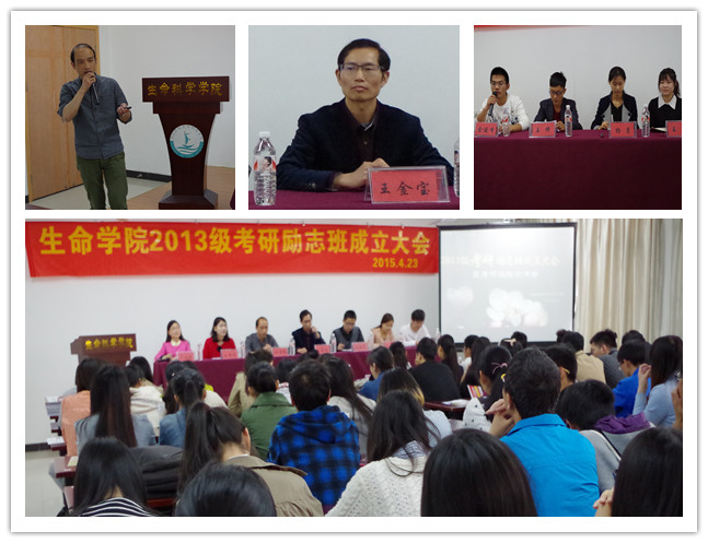 4月23日下午,生命科学学院于学院大会议室召开2013级考研励志班成立大会。学院党总支书记王金宝教授,励志班班主任钟永军博士,以及各班班主任出席本次大会。