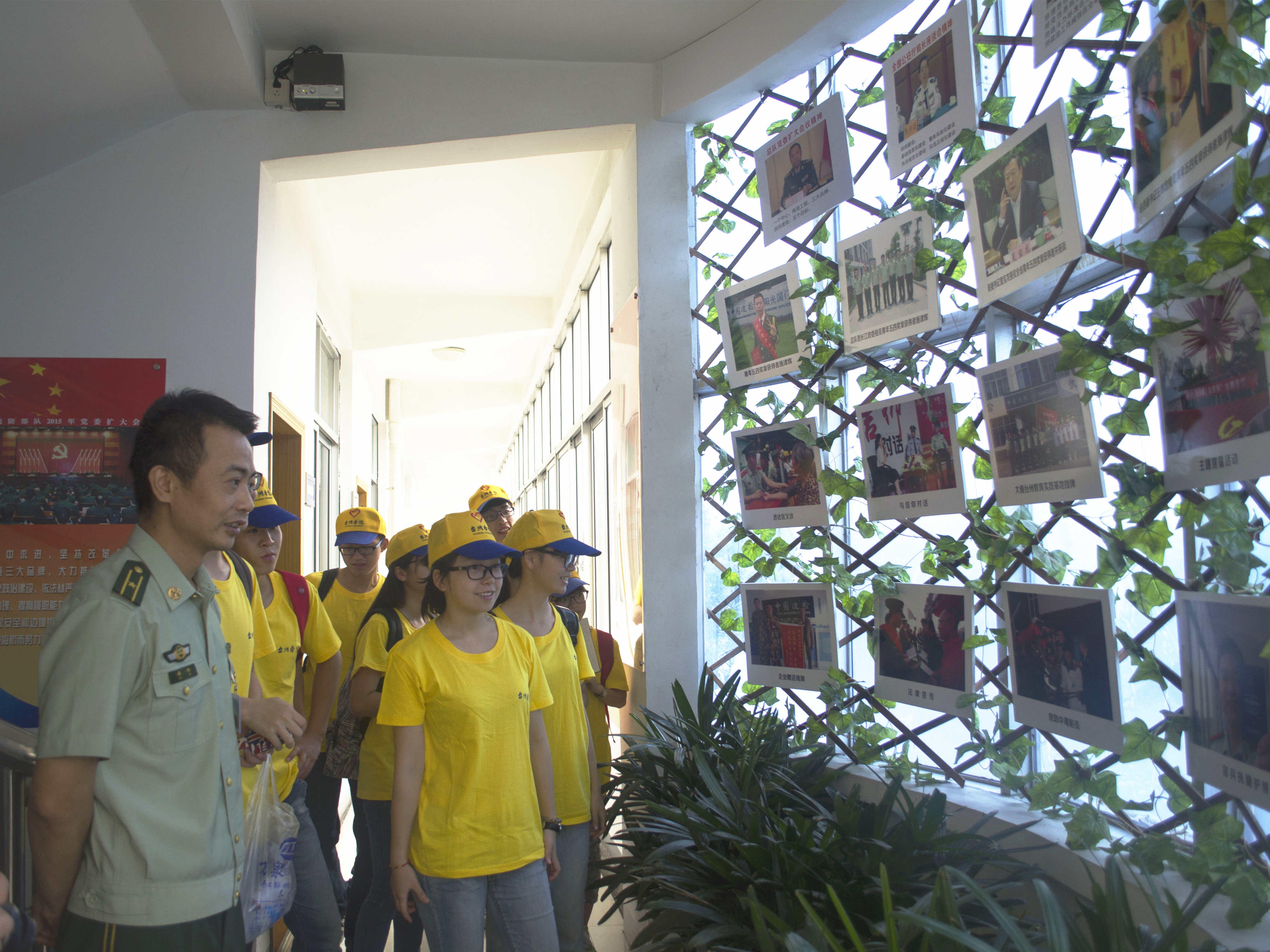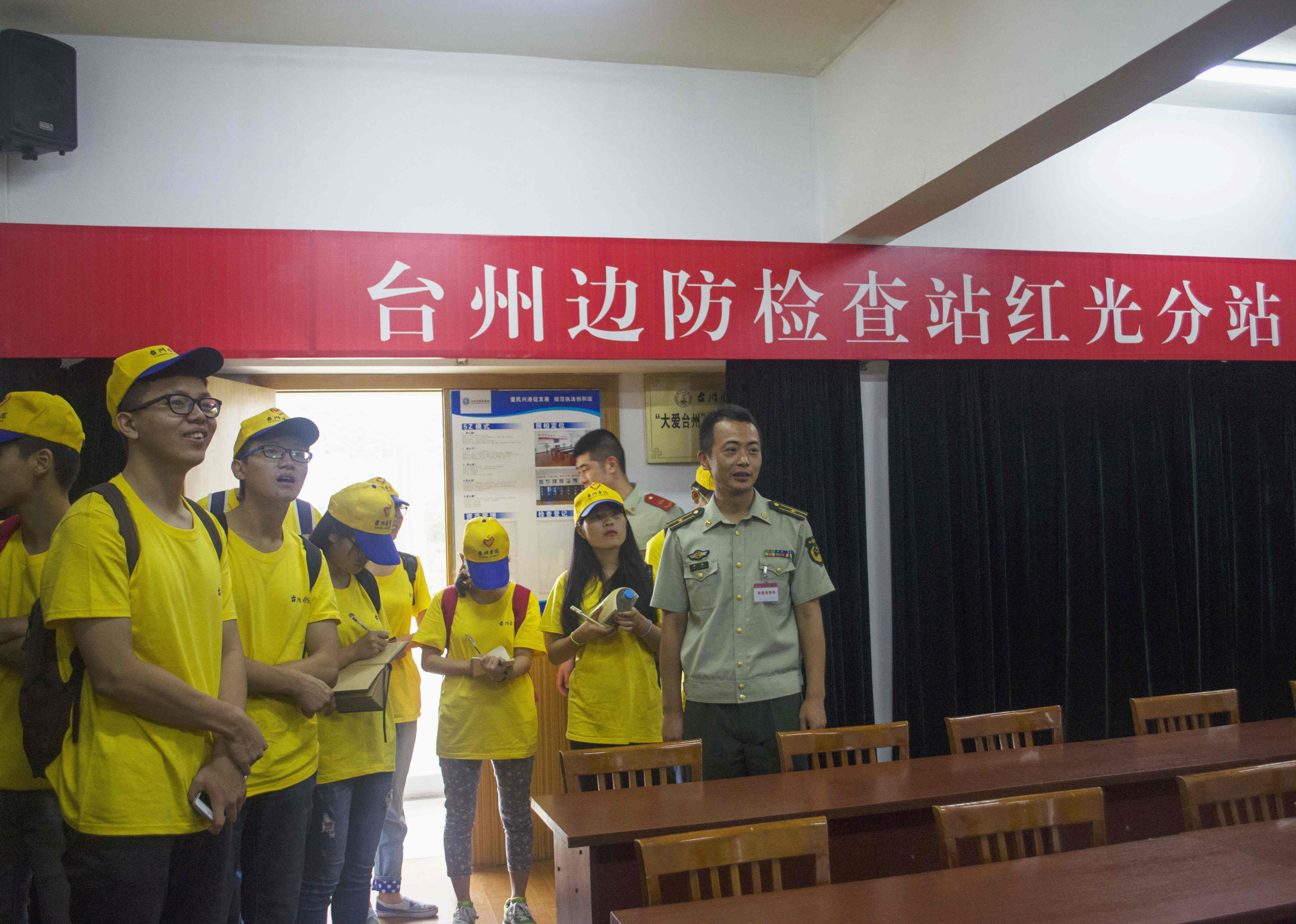 当天上午,在科值班领导吴杰的带领下,实践队成员们参观台州边检站红光分站的办公区、宿舍区、会议厅、生活服务区等。在红光分站的支部会议室里,悬挂着国家领导人的题词,这些成了战士们平时警示自己的标语。实践队员在参观晚官兵的宿舍后,还向他们学习了如何叠军被,大家对战士们叠的军被发出一声声赞叹。在装备处,眼花缭乱的装备惊艳了大家的眼球,不少成员试穿起战士们的装备。