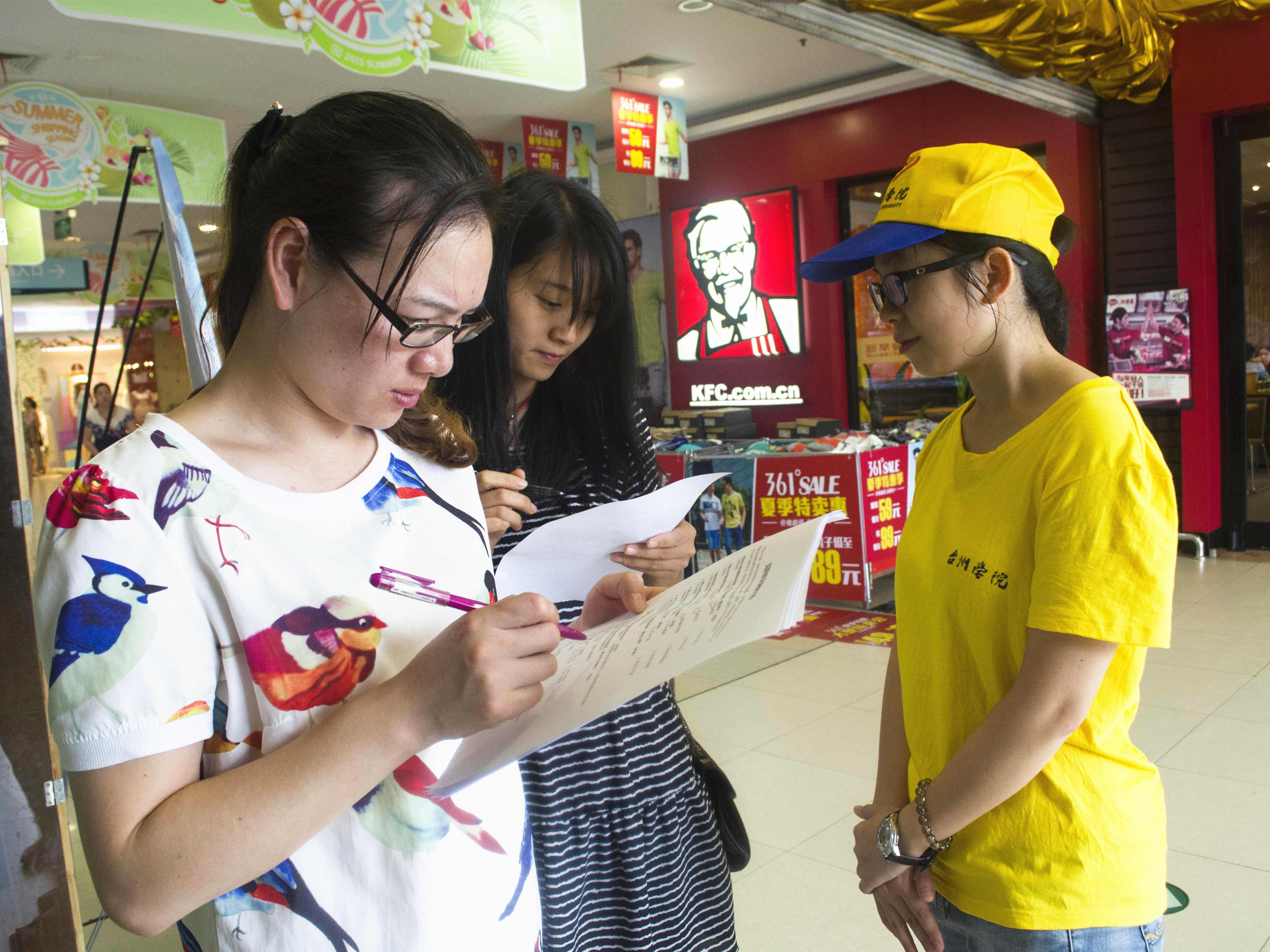 此次调查分成三个小分队,分别对地下人行道,世纪联华超市门口,小吃街三个地方的人群进行抽样调查。调查过程中,经过实践队员们礼貌的招呼,许多行色匆匆的人都停下来,专心致志地边填问卷,边听实践队员介绍。忙碌的人们也会立即放下手中的活儿,好奇地与我们交谈。