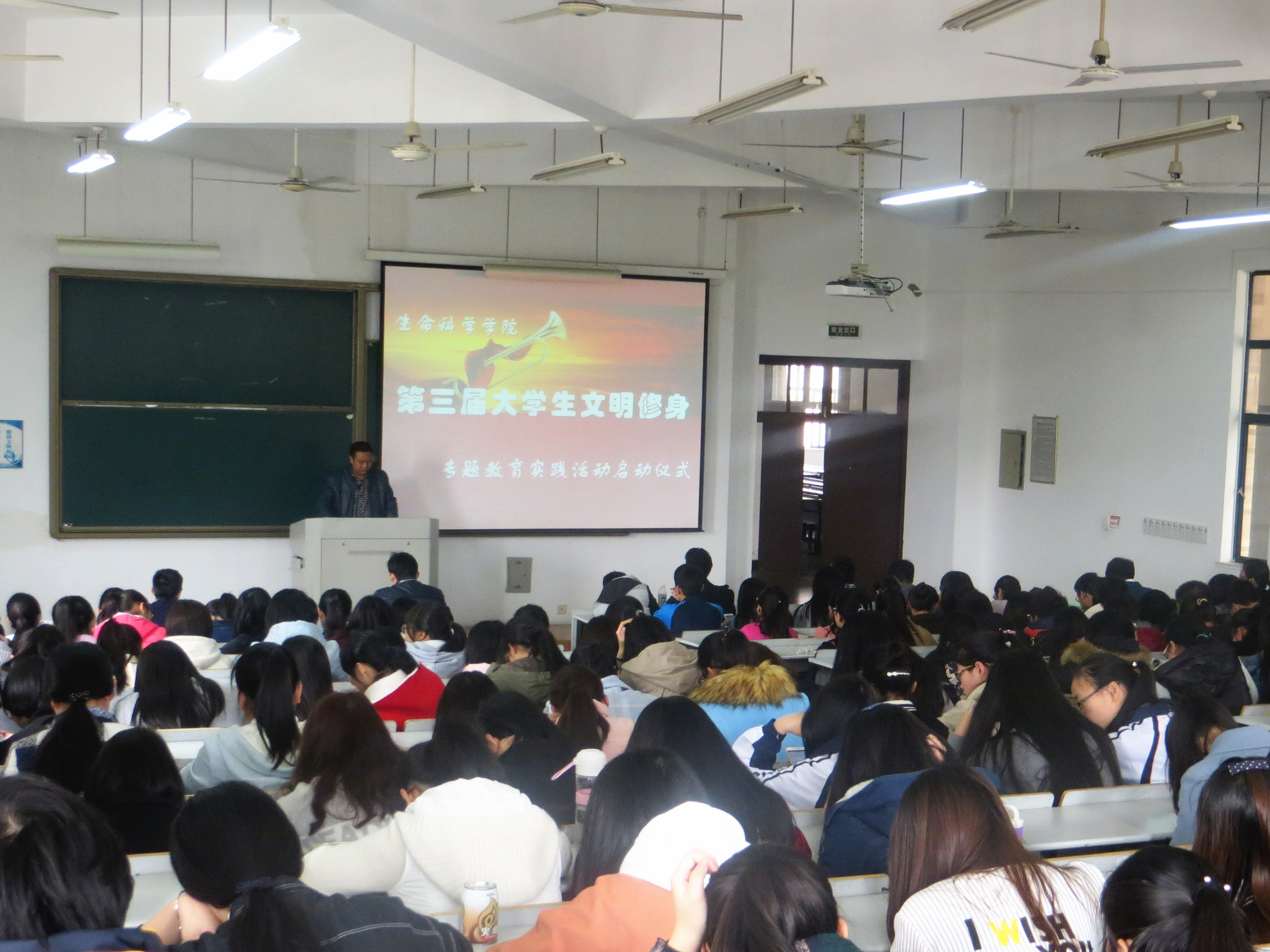 为教育引导广大青年学生积极践行社会主义核心价值观,提升大学生思想道德水平和文明素养,根据省教育工委、团省委、省学联于2016年初联合下发《关于在全省高校开展大学生文明修身”专题活动的通知》(浙教工委【2016】1号)文件,生命科学学院实施“大学生文明修身”专题教育实践活动,学院3月17日下午举行了“第三届大学生文明修身”启动仪式。