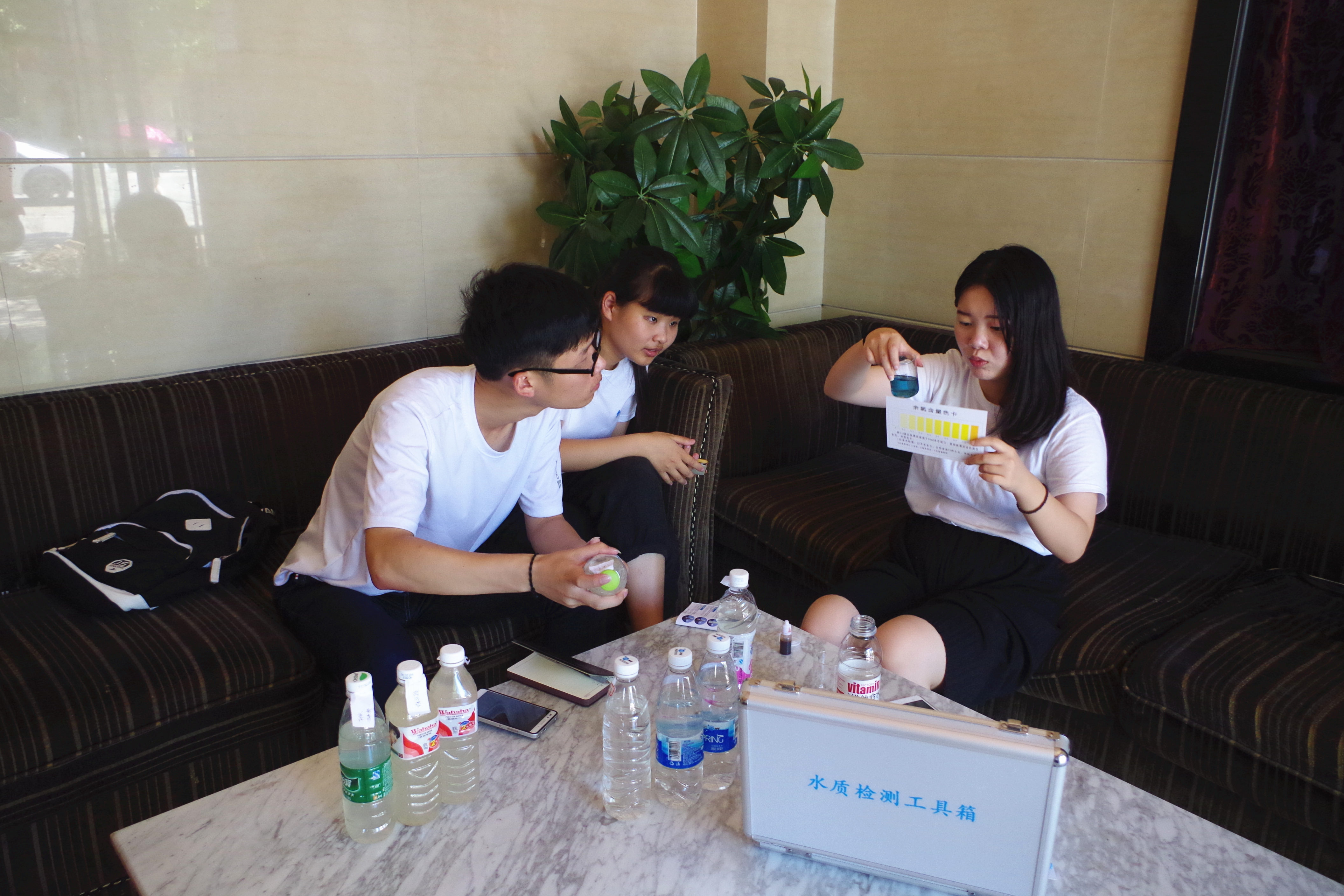 当日,实践队员分别到同善塘河源头杜芳水库、农田灌溉区、工业区、居民区等具有代表性的地方采集水样。并对水样进行了pH、溶解性固体总量(TDS)、余氯,浊度等方面的测量。检测结果发现芳杜水库的水质比较优良,根据有关分析报告能达到三类水质要求。在徐斗工业区处的水质明显表差,水体pH呈酸性,溶解性固体总量明显增加,水质浊度偏高,说明工业区的排放对水体环境影响比较大,到下游的居民区水质状况有所缓解,说明水体有一定的自净能力。实践队员还将带回水样在实验室进行氮、磷、高锰酸盐等指标的检查,进一步分析水体环境,为同善塘河水体环境的治理提供有效的依据。