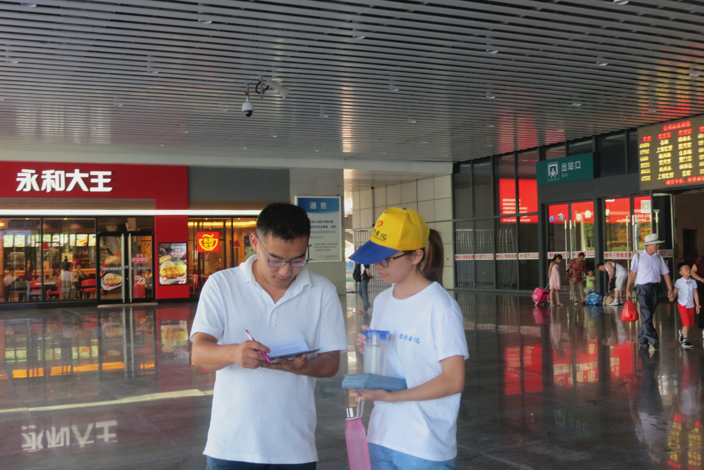为进一步宣传海洋生态保护和开展禁渔期的重要性,提高市民对海洋资源保护意识,台州学院“海洋之心”暑期社会实践的队员们于7月5日上午来到台州动车站,向正在候车的旅客递出手中关于保护海洋生态意识调查的问卷,并呼吁他们一起关注海洋。