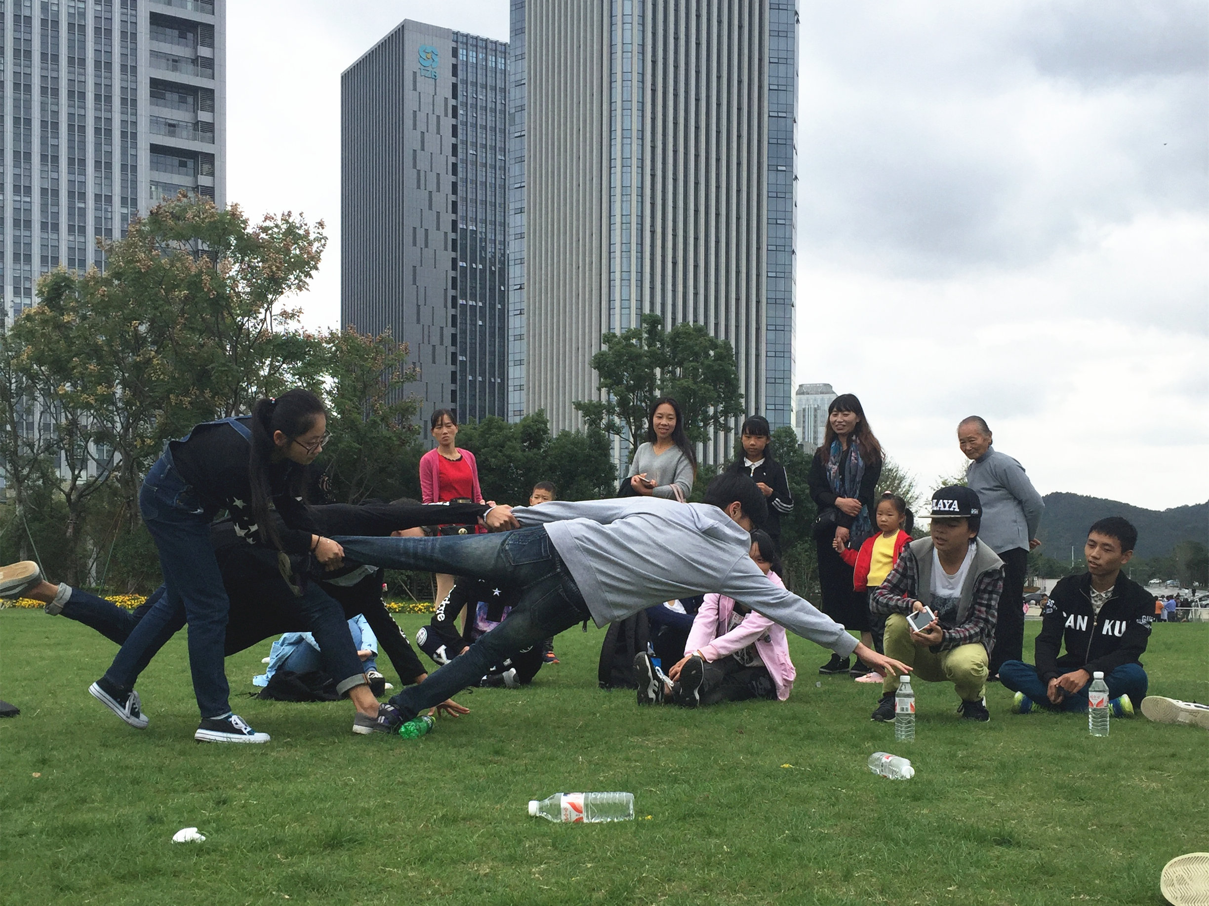 也许大家看到拓展训练几个字会和严厉、军事化一些词语联系起来,但是并不然,环境保护协会的这次拓展训练充满欢声笑语,是对团队默契和信任的一次考验。这个拓展训练的项目包括雷区取水、同起同坐、吹气球大战和信任背接。雷区取水,前面的人放大胆子去够水瓶,后面的人尽力拉住前面的人腿,培养了协会成员间的相互信任。同起同坐,两个人背靠背同起同坐,听起来简单,做起来却很难,正是因为你不能用自己的双手,只能依靠那个与你背靠背的人,培养了成员间的良好默契。而在这四个项目里,最刺激的莫过于是信任背摔:一个女生站在高台之上,背向地面放松躺下,而高台之下的男生用手搭一张“网”接住女生,这不仅十分考验体验者的勇气,更考验了协会成员的执行力。