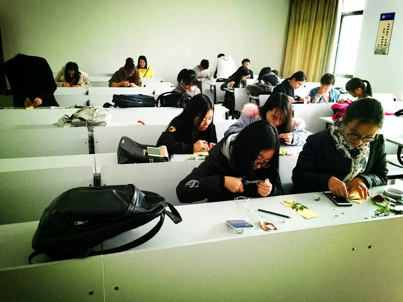 落叶书签,顾名思义,即是用各式各样的落叶在空白书签上勾画,最后编织成一张精美的个性书签。本次活动共吸引了44组,共96人参加,各队在有限的时间内,发挥无限的想象,通过用剪刀、胶水、彩笔等工具,非常细心地为落叶书签作更好的修饰,比赛现场热闹非凡。作品制作完成后,参赛人员向评委们展示作品,阐述作品名称以及设计理念。评委们从创新、美观等方面打分。结合微信投票成绩,本次比赛共决出一等奖一名,二等奖两名,三等奖三名。最终,具有独特视野的异类、充满活力的春之女孩和浪漫旖旎的梦中情人获得比赛的前三名。