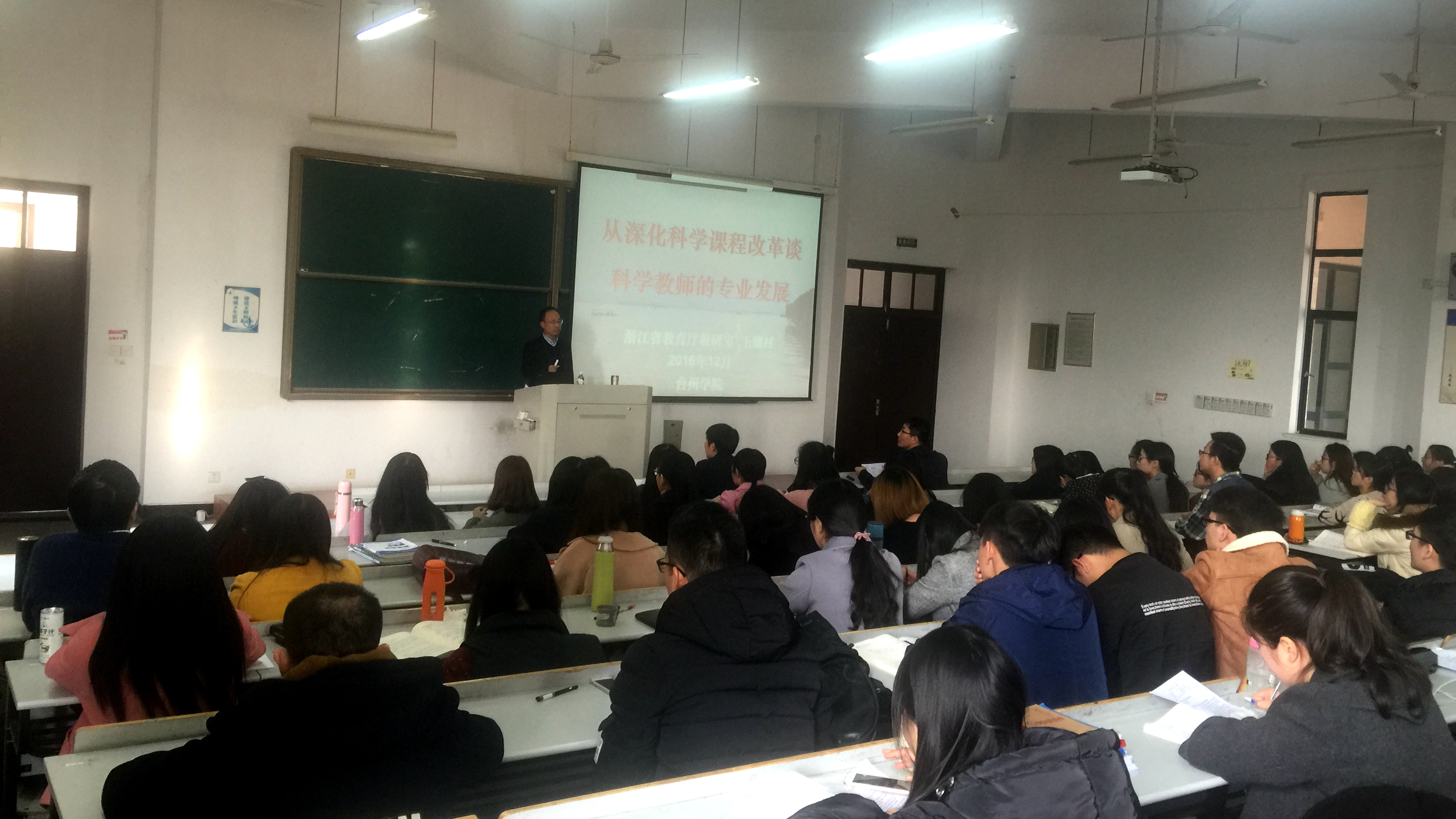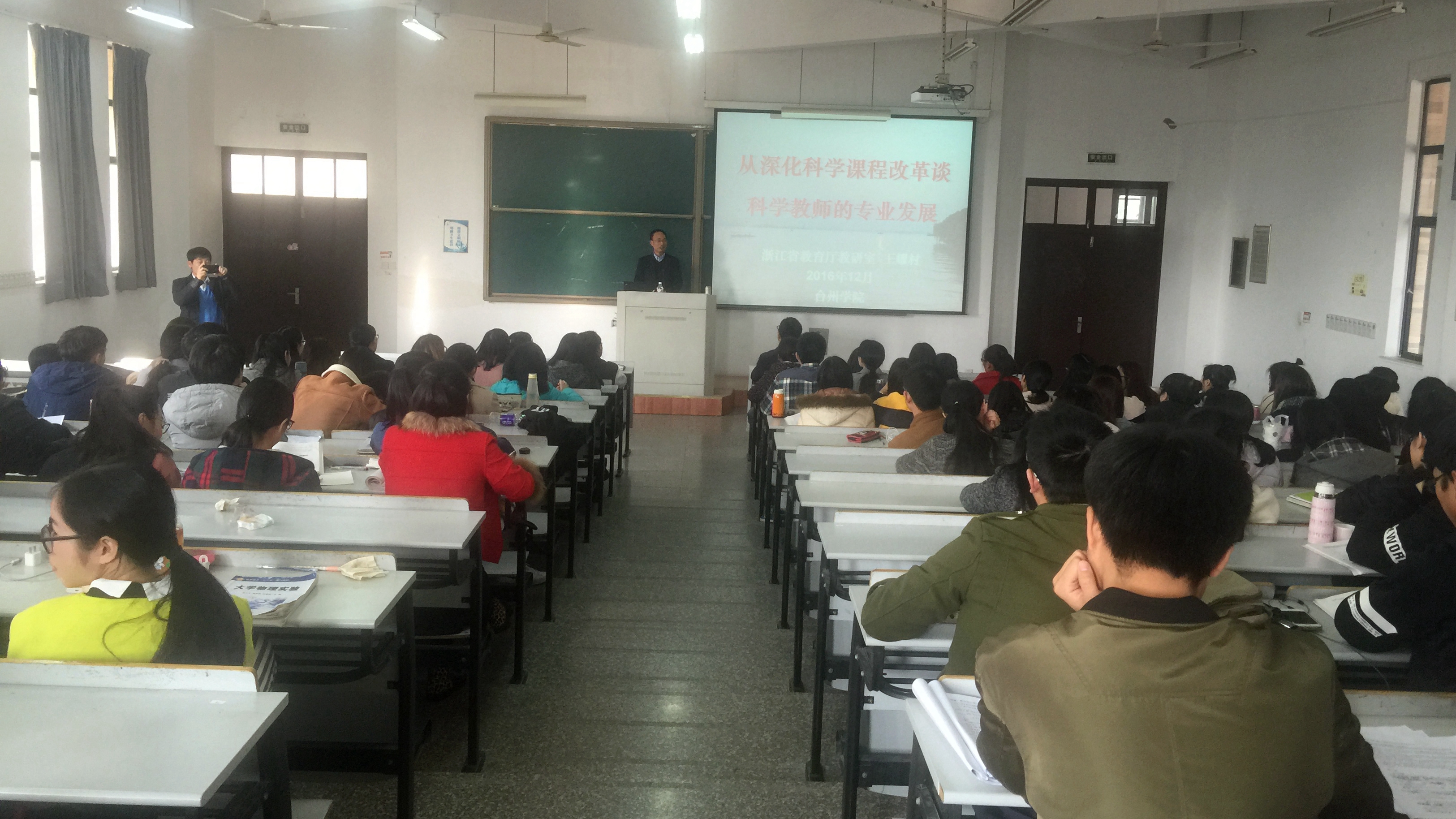 12月7日下午,浙江省教育厅教研室初中科学教研员特级教师王耀村应邀做客德业大讲堂,在椒江校区2-205为师生作《从深化科学课程改革谈科学教师的专业发展》专题学术讲座。生命科学学院副院长孙长森主持讲座。