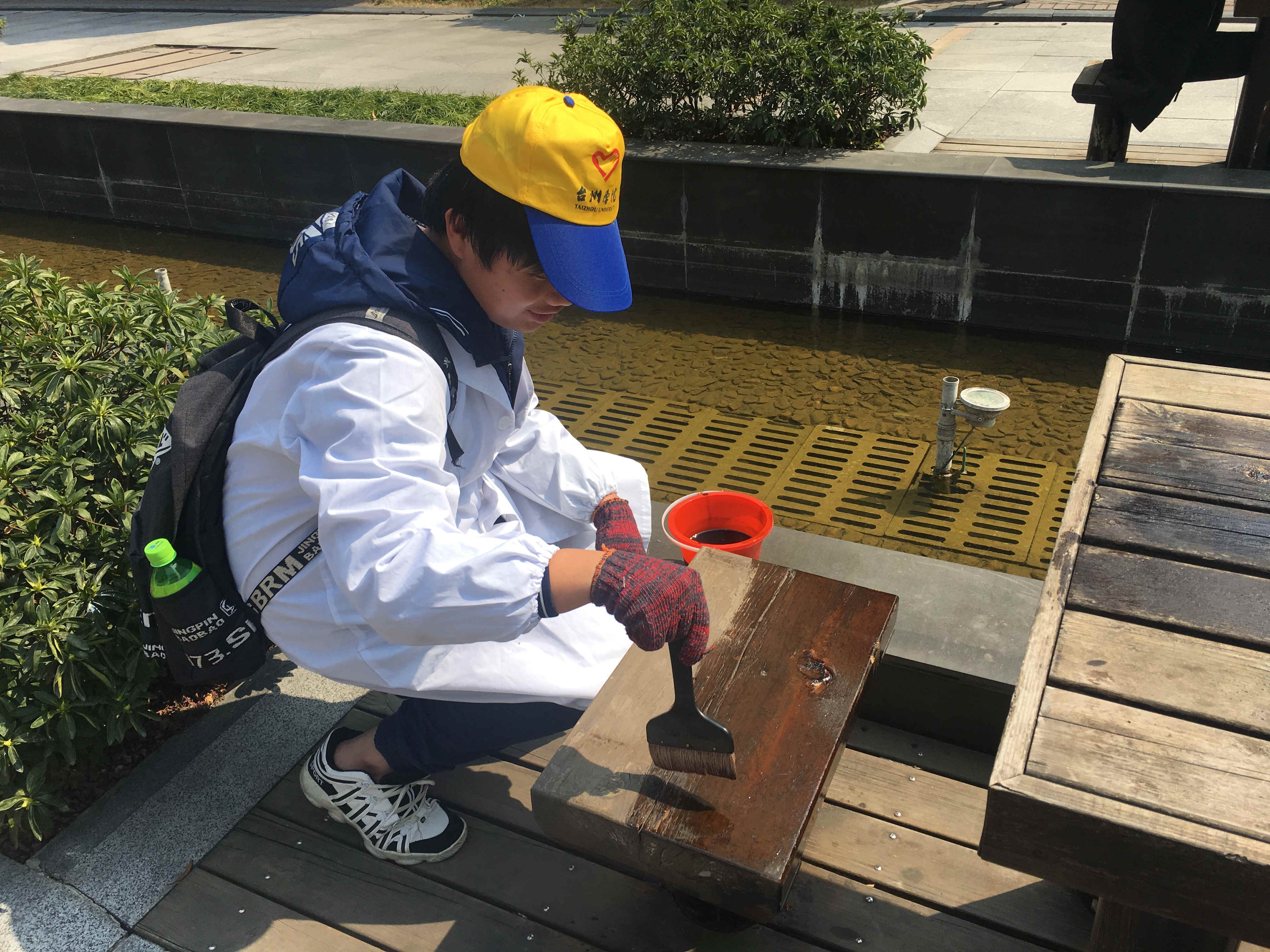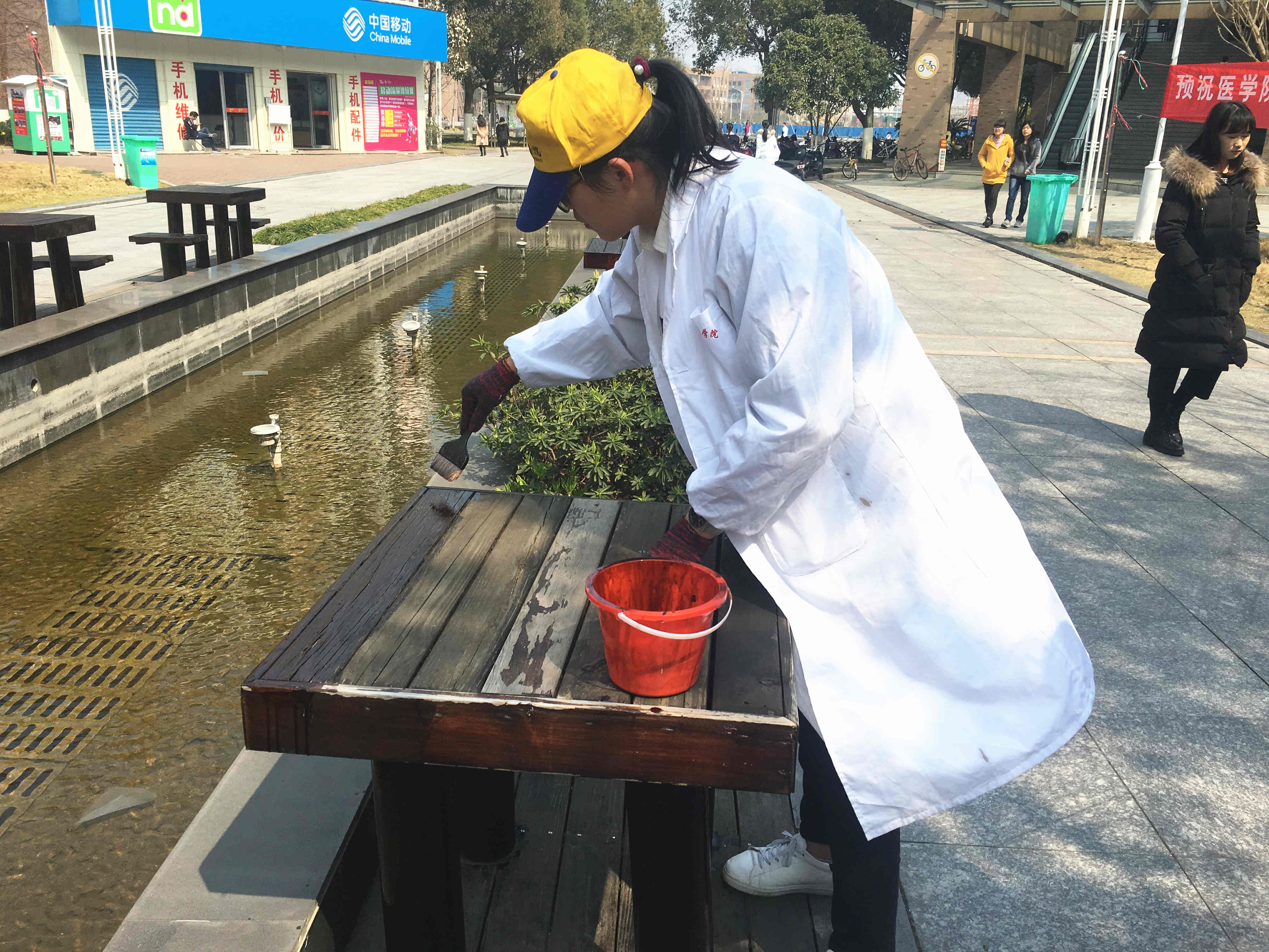 为美化校园,打造最美水街,3月9日,生命科学学院的党员服务队和志愿者服务队为宿舍区水街两旁年久脱漆的公共休息桌凳涂刷油漆,为同学们带来耳目一新的水街环境。本次活动校后勤服务管理处为志愿者提供油漆、刷子、手套等必要工具。