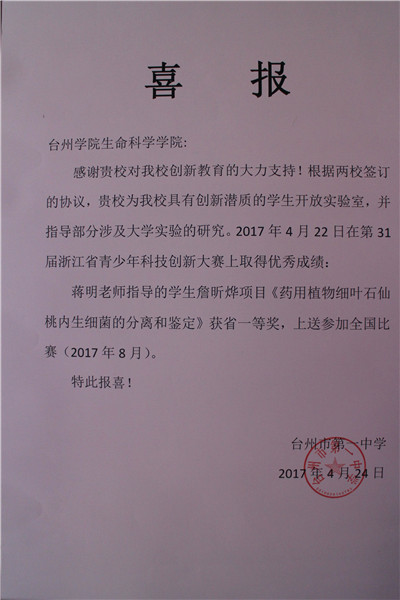 日前,从台州市第一中学传来捷报,由我院蒋明团队指导完成的该校学生科技创新项目《药用植物细叶石仙桃内生细菌的分离和鉴定》获得了第31届浙江省青少年科技创新大赛一等奖的好成绩,并被推荐参加于今年8月举行的全国赛。