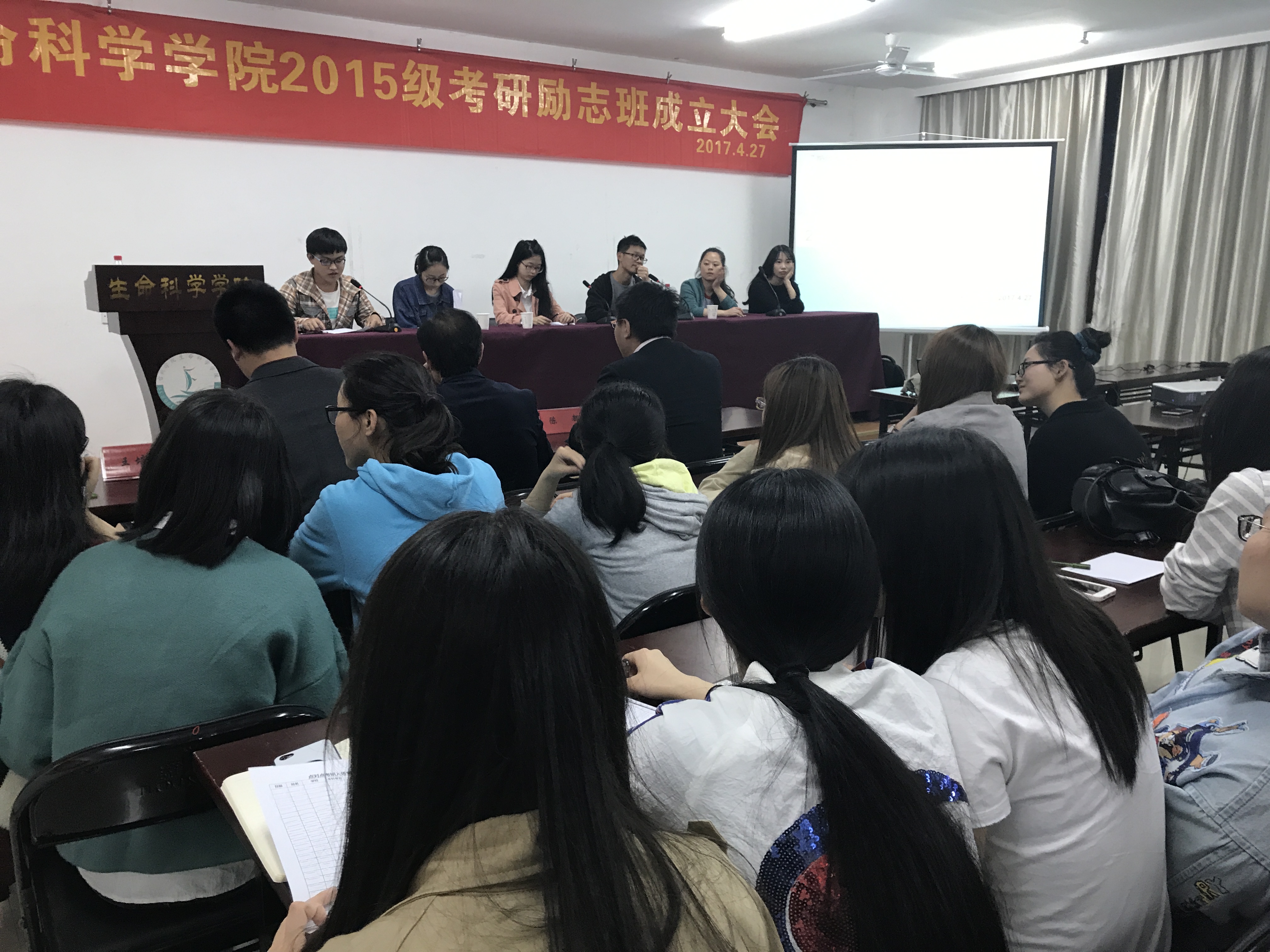 4月27日晚上,生命科学学院于党员之家召开2015级考研励志班成立大会。学院党总支书记王金宝教授,15级考研励志班班主任王江教授,辅导员王培蕾老师、尤灵敏老师以及点对点教育陈都老师受邀出席本次大会。