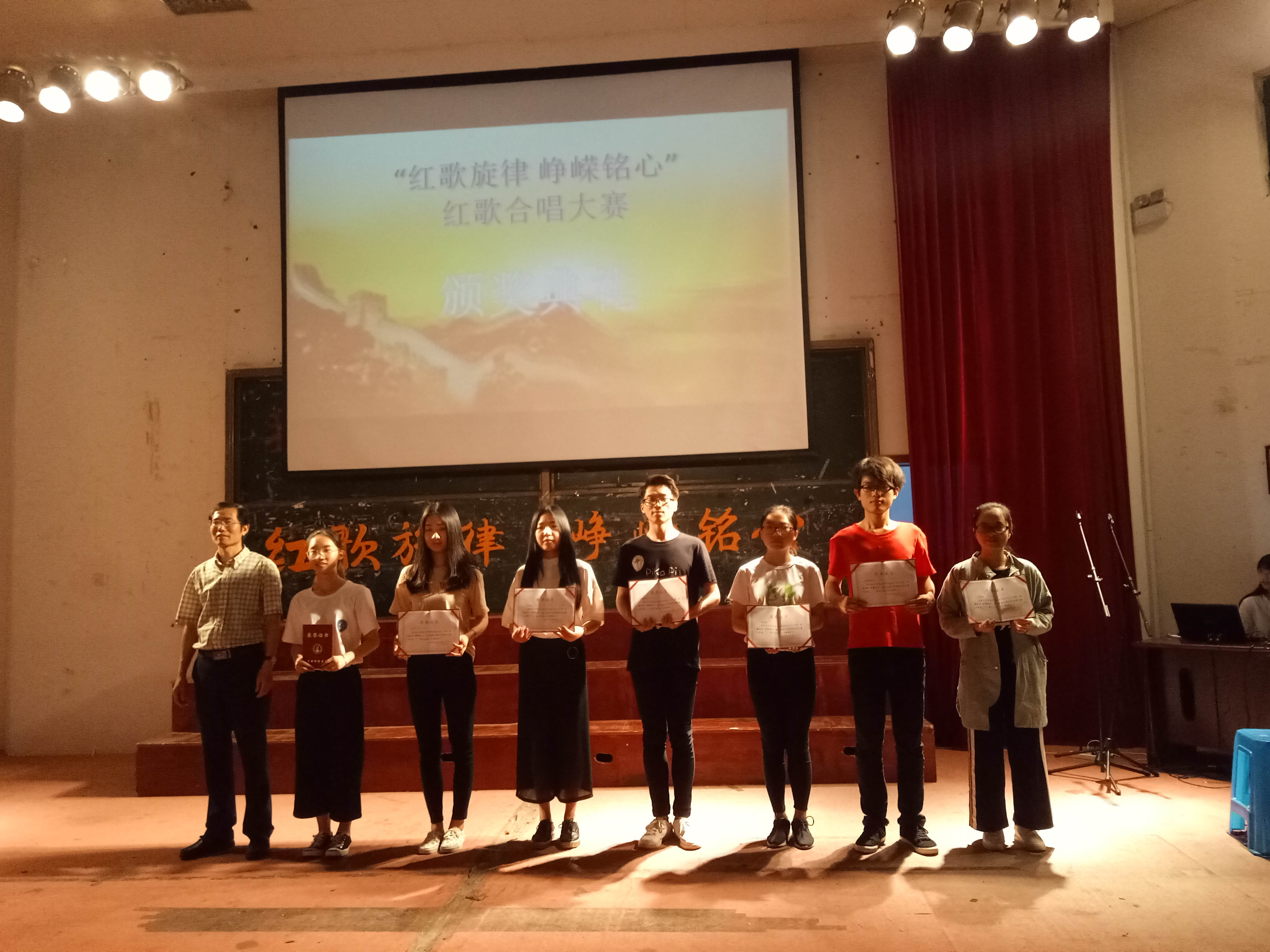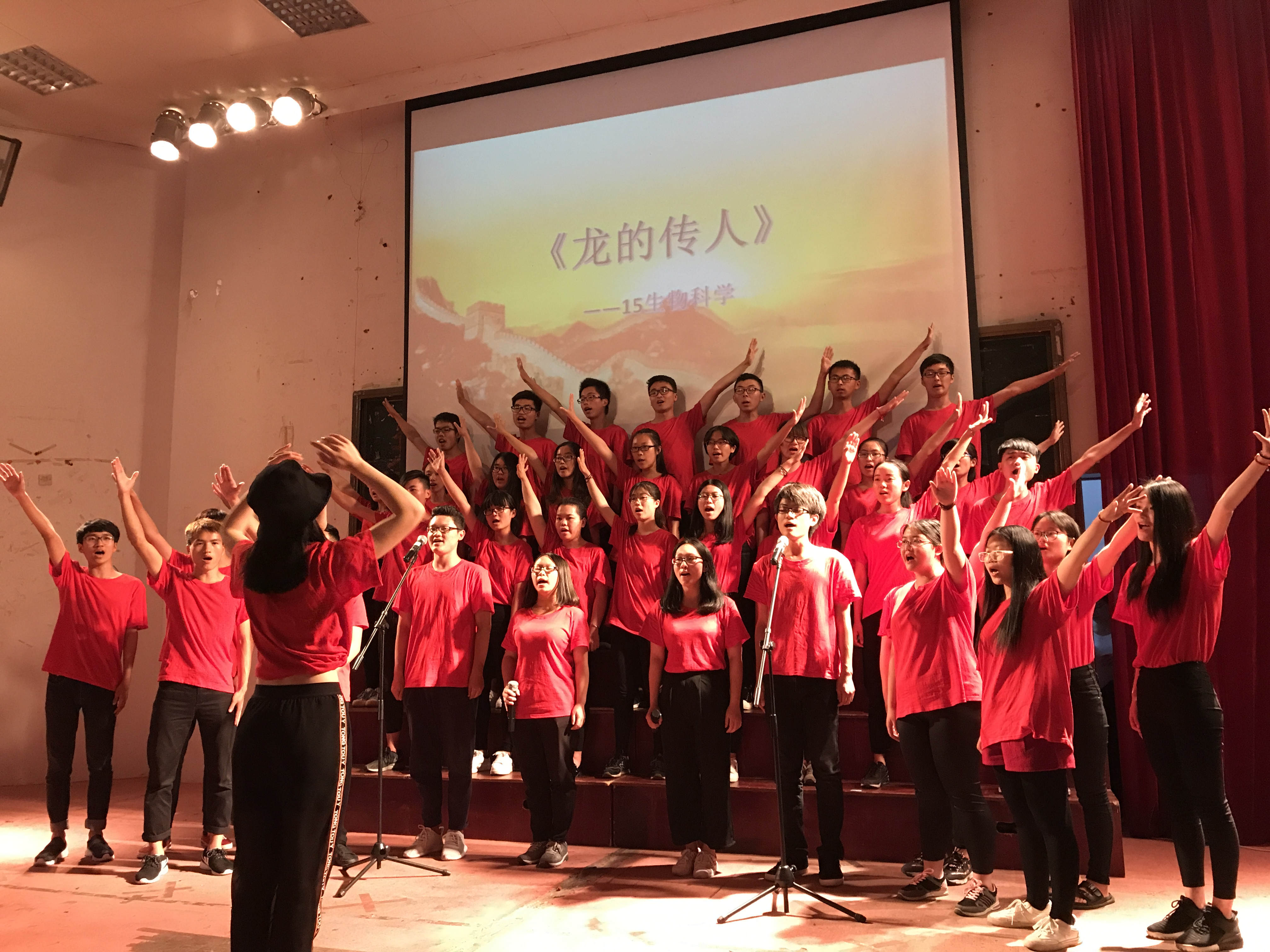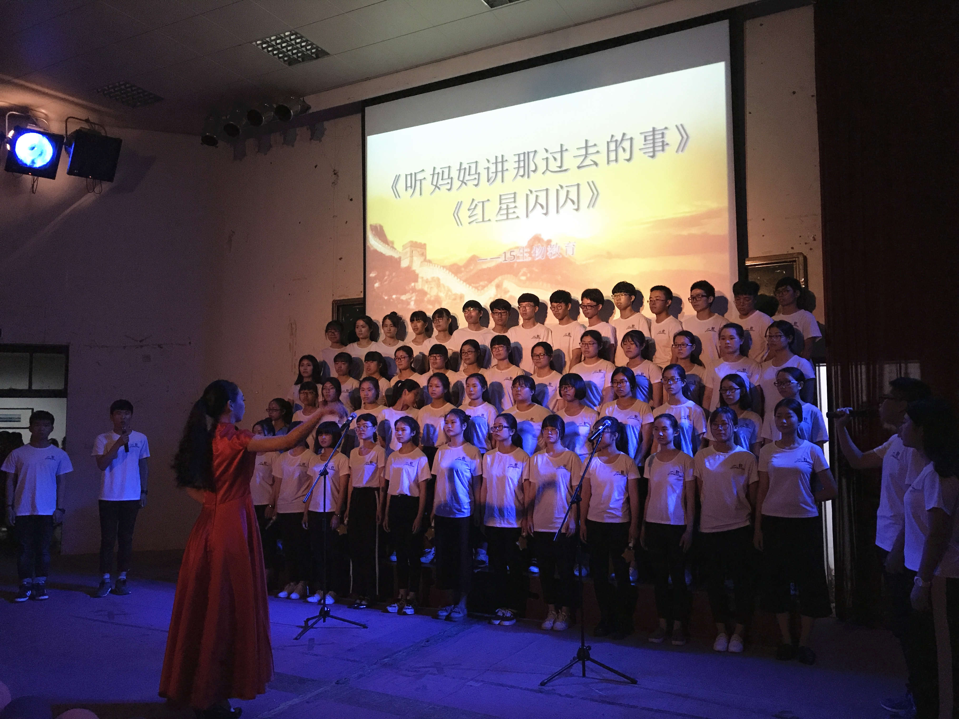 在观众热烈的掌声和响亮的欢呼声中红歌大赛的帷幕拉开。16生物工程以一首《天耀中华》火热开唱,充满激情,唱出来了每个中国人对中华民族的民族情感;由16科教34班带来的《国家》振奋人心,歌声中洋溢的对国家富强的自豪感;15环境工程以多种形式演唱了《我爱北京天安门》和《歌唱祖国》,结合动感的舞蹈,将合唱大赛推向高潮;15生物教育的《听妈妈讲那过去的事》和《红星闪闪》为我们诠释了对母亲和国家的爱。还有《七子之歌》、《真心英雄》、《龙的传人》等一首首耳熟能详、充满激情和正能量的歌曲飘荡在会场的上空,抒发了同学们热爱党、热爱祖国的情怀,赞美中华民族自强不息的伟大精神,歌颂了丰功伟绩。活动期间,同学们深情并茂地演唱和充满感情的歌声赢得了观众的阵阵掌声。最终15生物教育演唱的《听妈妈讲那过去的事》和《红星闪闪》以其嘹亮的歌声、深情的演绎夺得本次大赛冠军。