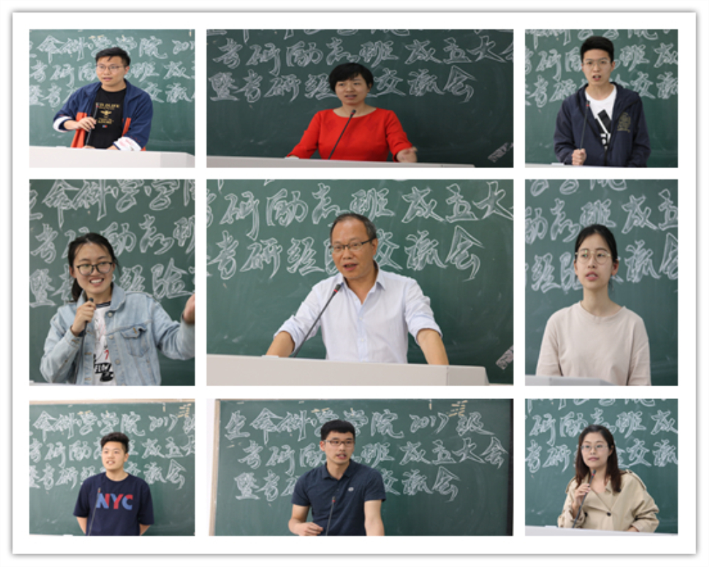 经验交流环节,14生物工程班陈耀、15生物科学(师范)班杨盛羽等6名考研成绩优异的学生代表应邀出席,为学弟学妹们传经送宝。他们就院校选择、专业确定、计划制定、复习方案、复试技巧等多方面进行了全方位的详细介绍,鼓励学弟学妹们早下决心、早定目标、早些行动,并祝愿同学们都能披荆斩棘,考上理想学校,成就美好人生。