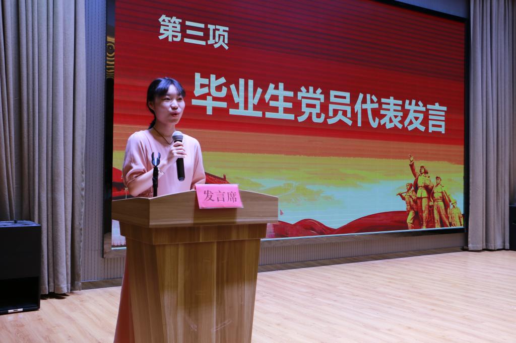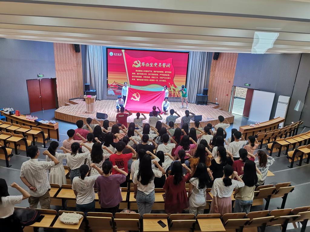 会场奏响雄壮的《国际歌》,宣誓仪式正式开始,柯世省同志带领全体与会党员面向鲜红的党旗,高举右手,庄严宣誓,郑重表达了对党的忠诚和为共产主义事业奋斗终身的决心,进一步激发了大家作为一名共产党员的自豪感和责任感。毕业生党员代表冯洁琦在发言中深深地表达了对母校的眷恋之情、感激之意和敬爱之心,表示今后会时刻用共产党员标准严格要求自己,用实际行动践行党旗下的誓言。