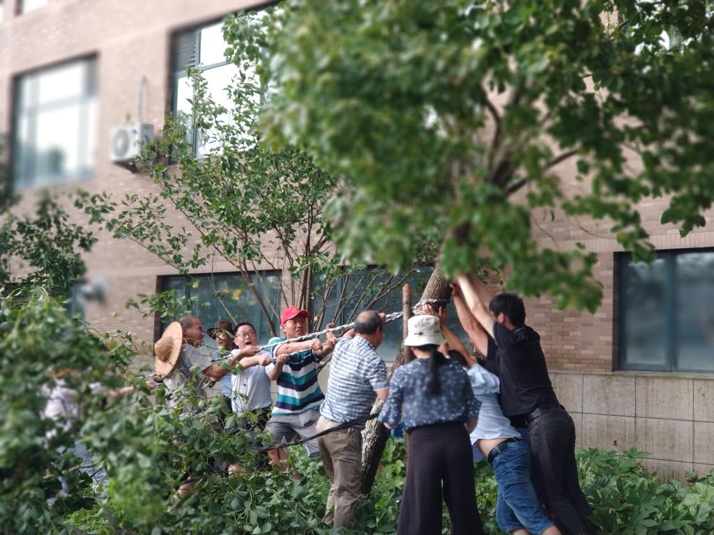 这次抢扶树木活动可谓男女老少齐上阵,从垂髻少童到花甲长者,不论是精壮汉子还是柔弱女子,无不热情高涨、干劲十足。大家修枝、挖坑、扶正、加固、培土,分工协作,秩序井然,不管暴雨如注,还是烈日当头,大家的热情丝毫不减。