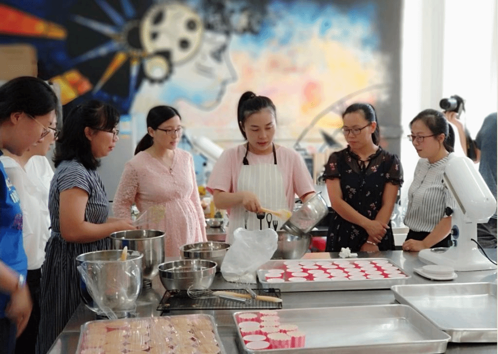 在欢乐轻松、温馨和谐的氛围中,大家在食品专业科班出身的教师指导下,做坯、调味、烘焙、裱花、定型,现场有条不紊、香气四溢、欢声笑语,弥漫着快乐和幸福的滋味。