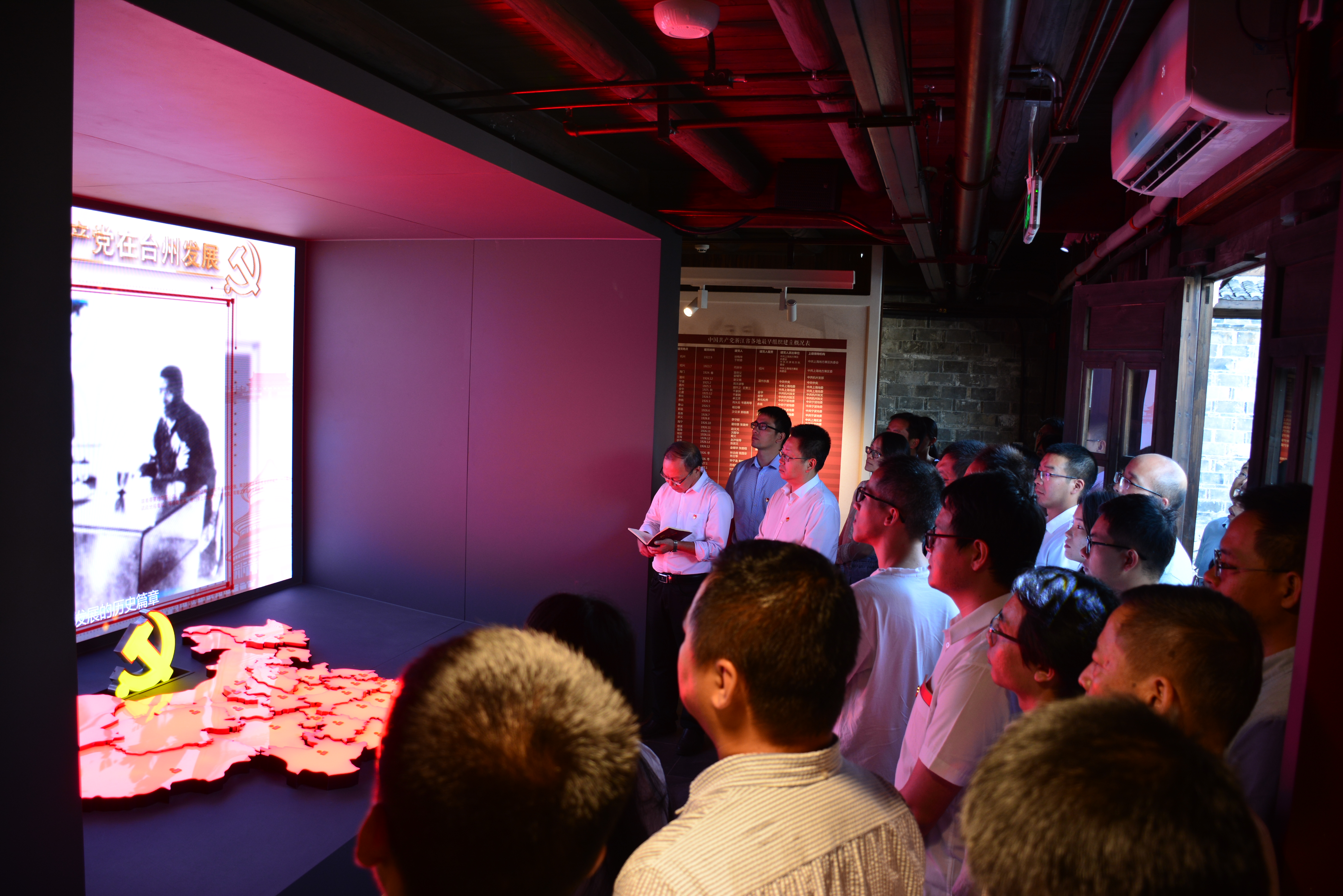 当天,阳光明媚,党员们跟随讲解员步入百年古韵的展馆,初映眼帘的是雷鸣“五四”展区,大家共同观看了《共产党点亮新中国》记录影片,了解了五四运动中的台州仁人志士以及中国共产党浙江省各地最早组织建立概况。随后,移步至“光闪葭沚”展区,葭沚的发展历史在多面墙体连在一起的巨幅投影中呈现,昔日的景象随着画卷铺展开来。接着,到了“红色火花组织初创”展区,1924年春,宣侠父同志在海门葭沚的浙江省立甲种水产学校内创建了台州第一个党组织——中共海门小组,发展了金辅华、江潭、樊松华、章尚友等人加入中国共产党,掀开了中国共产党在台州领导革命的历史篇章。最后,大家到了“亭旁起义”展区,了解先烈们为革命事业英勇献身、前赴后继的光辉事迹。一张张弥足珍贵的照片,一件件充满历史记忆的文物,一段段生动复原的历史场景,还有融合了现代化电子科技元素的英雄人物点赞魔镜墙等,身临其境,仿佛让时光又回到了那个风云激荡的峥嵘岁月。