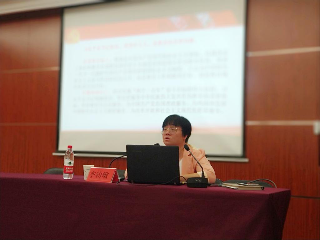 李钧敏以“立德树人,为国育才”为题,结合主题教育读原著学原文悟原理的所学所思所获,深刻诠释初心的内涵和使命的具体实践。不忘初心,就是要牢记党的历史,要坚定理想信念,要敢于担当作为,要不忘人民群众;牢记使命,就是要坚持马克思主义的指导地位,要坚信党的根基在人民,要高举改革开放旗帜,要保持党的先进性和纯洁性,要始终不渝走和平发展道路,要坚定 “四个自信”,统筹推进“五位一体”总体布局,协调推进“四个全面”战略布局。她指出,立足新时代高等教育的初心是 “立德树人”,高等教育的使命是“为党育人,为国育才”。全校上下要统一战线,坚持“以本为本”,要深入推进“四个回归”,把人才培养质量和效果作为学校教学工作的出发点和落脚点。