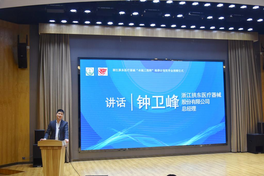 钟卫峰简要介绍了浙江拱东医疗器械股份有限公司的情况,肯定了学校和学院办学特色,并对学生在学习和工作等方面给出了非常中肯实用的建议。