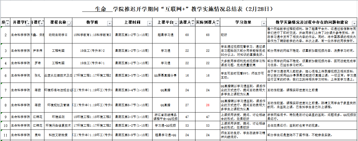 为保证线上教学活动正常有序开展,生命科学学院持续跟进老师们的教学进度及效果,通过“每日反馈”的方式,统计当日每门课程实际到课人数、学生学习效果、教学实施情况及教学过程中遇到的问题和建议,并及时将问题反馈给学校教务处相关负责人,积极协助教师解决线上教学中出现的问题。同时,根据每日反馈情况,积极向老师推荐教学效果好的平台和教学方式,助力提高授课效果,确保“互联网+”线上授课“有实效”。