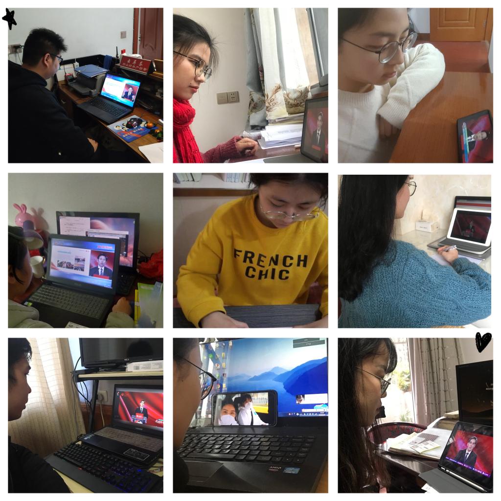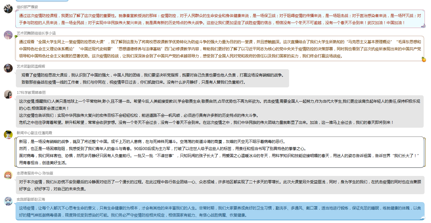 通过近两个小时的学习,学院师生深受鼓舞,收获颇丰,纷纷表示在抗击疫情斗争中深化了理论认识,在疫情大考中感受到了中国特色社会主义制度的优势,学会了用历史思维看待疫情,也增强了抗“疫”必胜信心,最重要的是,从战“疫”里的最美青春中,觉察并充分唤醒了作为当代中国青年的责任与担当!生命学子纷纷发起承诺:将听从学校安排,保持联络通畅,不提前返校;不随意外出,勤洗手,戴口罩,积极配合查验,每日定时汇报健康情况;主动从官方渠道获取权威疫情进展,不信谣、不传谣,彰显当代大学生的责任与担当。待到春暖花开时,让我们早日在台院再度重相逢!