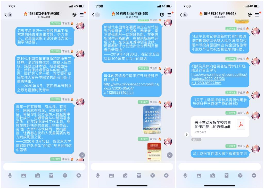 院内各班级结合实际情况通过钉钉、微信、QQ群等平台,组织班级同学“线上”观看“开学第一课”,并结合2020年五.四青年节主题——奋斗的青春最美丽,开展“线上”主题团日活动,结合ppt讲解和视频短片的学习,深刻领悟习近平总书记对新时代青年的燃情寄语和殷切嘱托,一边开展“线上”讨论,一边以寝室为单位展开“线下”热议,一起分享自己身边的抗疫故事和学习感悟。与此同时,同学们还积极撰写学习心得,畅谈学习认识,发表体会感想,学院共计收到学习心得1000余篇。同学们纷纷表示:2020年新冠肺炎突然来袭,造成了巨大的人力物力损失,也让大家感受到此次开学的来之不易。虽然大家不能去到一线战斗,但是同学们表示,将尽自己的努力为防疫工作做力所能及的事情。服从学校安排,听从老师们的指挥,认真完成每日汇报,减少不必要的外出,减少不必要的聚集,从身边小事做起,用行动支持防疫工作。