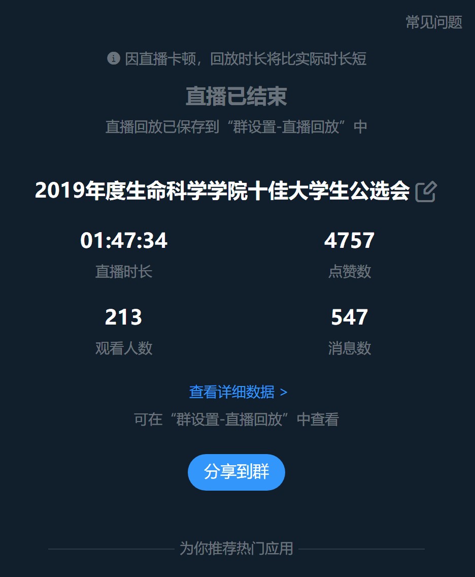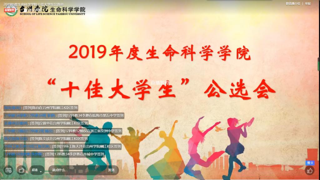 为全力落实疫情防控要求,有效减少人员流动和聚集,降低交叉感染风险,5月24日晚,生命科学学院通过钉钉群直播的方式,“线上”举行了2019年度“十佳大学生”公选会。学院党政领导、班主任、辅导员及各班大众评审代表“线上”参与评审。