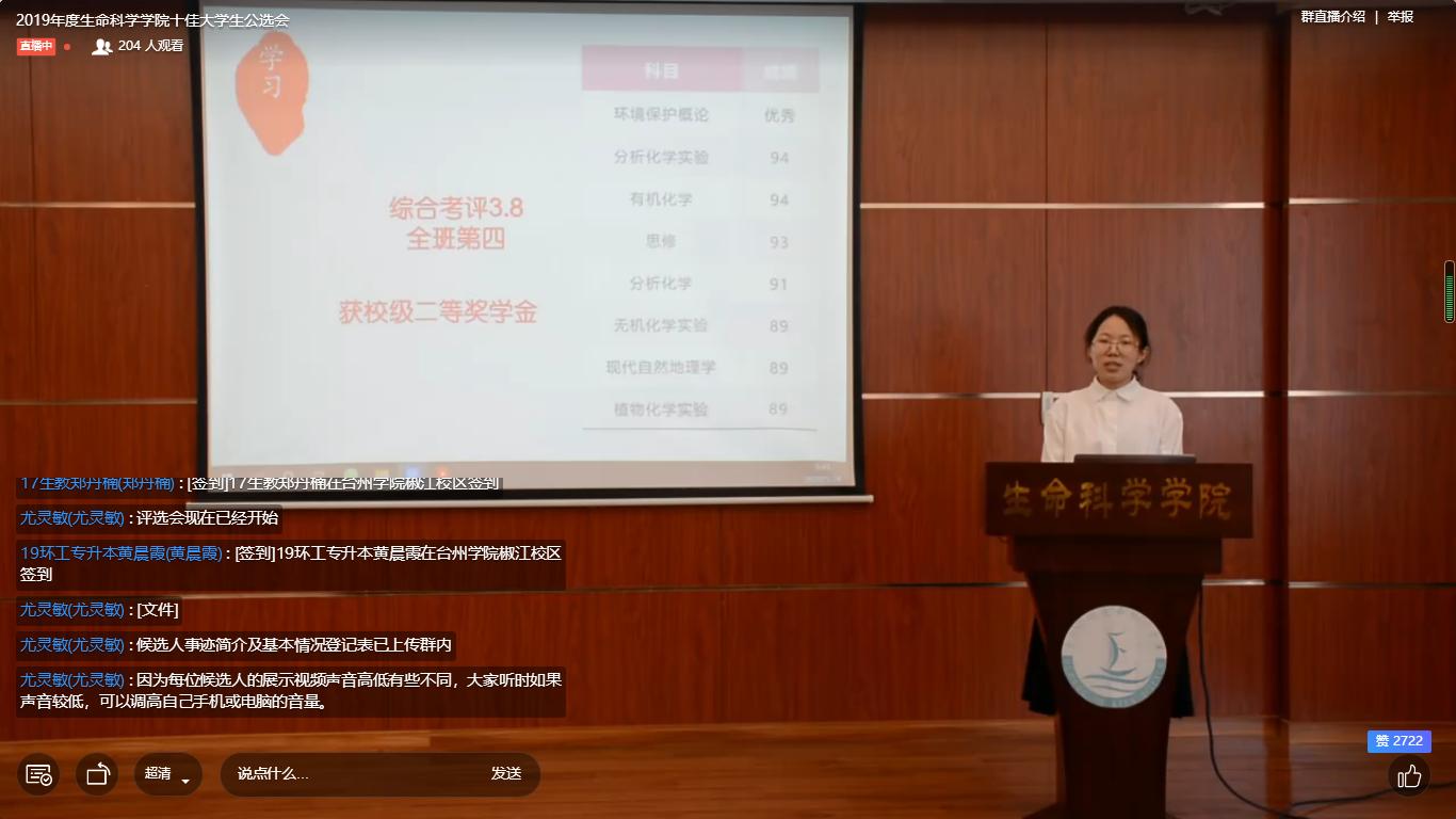 尽管是以“线上”直播的方式开展,但这并不影响10位候选的精彩汇报,10位优秀学子或慷慨激昂、或幽默风趣、或端正严肃,在台上自信展示,讲述各自在学习、工作、生活上的奋斗历程和高光时刻。有的分享丰富的学生干部工作经历,有的阐述自己的学习、科研见解,有的讲述参加志愿活动展现青春风采的故事。他们努力且上进,自律且自由,以执着之心书写青春华章,用自身的经历演绎“道阻且长,行则将至”的真谛。评选会上,候选人妙语连珠,获得了屏幕前各位评审代表的啧啧称赞。最终,综合微信网络投票和公选会现场投票结果,潘苑霞等八位同学当选为2019年度生命科学学院“十佳大学生”。