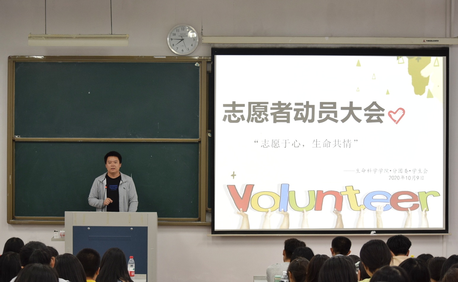 为弘扬志愿者精神,进一步壮大志愿者队伍,引导大学生积极参与志愿服务活动,10月9日晚,生命科学学院在2-303召开“志愿于心,生命共情”志愿者动员大会,学院分团委书记尤灵敏出席,全体2020级新生参加。