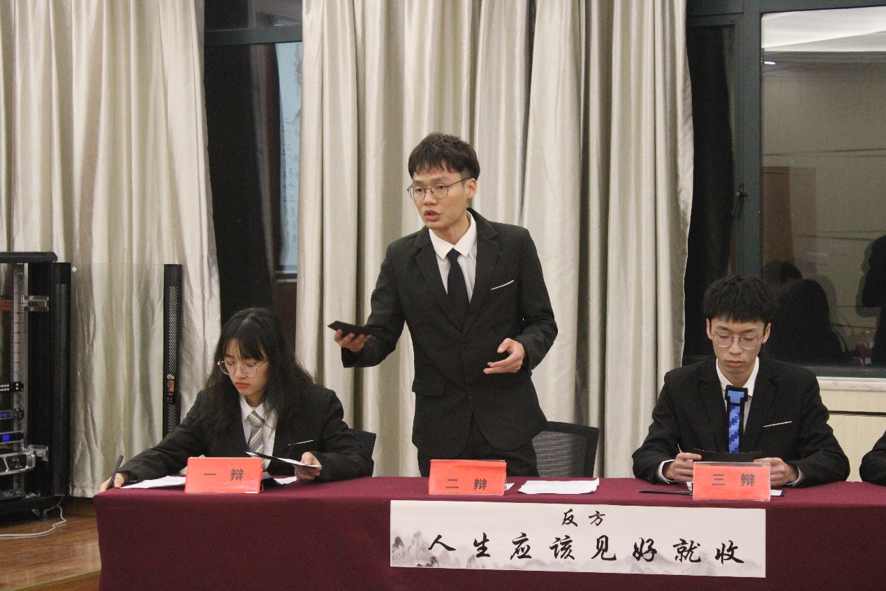 本次决赛的辩题是“人生当见好就收还是乘胜追击?”,双方一辩从人生价值的看法和见好就收、乘胜追击的定义等方面切入,明确地表达己方的观点。在随后的攻辩环节中,双方二辩、三辩紧抓对方陈词漏洞,直击要害,再一次论证己方的观点。激烈的自由辩论环节燃爆全场,正反双方针锋相对、步步为营,寻找对方逻辑漏洞,加固自身防线,妙语连珠的问答让现场的观众惊叹不已。在一番你来我往、唇枪舌剑过后,由双方四辩进行总结陈词,再次巩固己方观点。在辩论赛后的点评环节中,评委们对各队整体表现进行了深刻剖析,肯定了双方辩手的精彩表现,同时也提出了可以改进的不足之处,最后,尤灵敏对本次比赛进行总结,发表对“人生”的看法,加深同学们对辩题的理解,引导同学们在平时的学习生活中学会独立、深入地思考社会现象背后的本质问题。根据评委们的评审打分,最终19生物科学夺得本次辩论赛的冠军,19生物制药获得亚军。