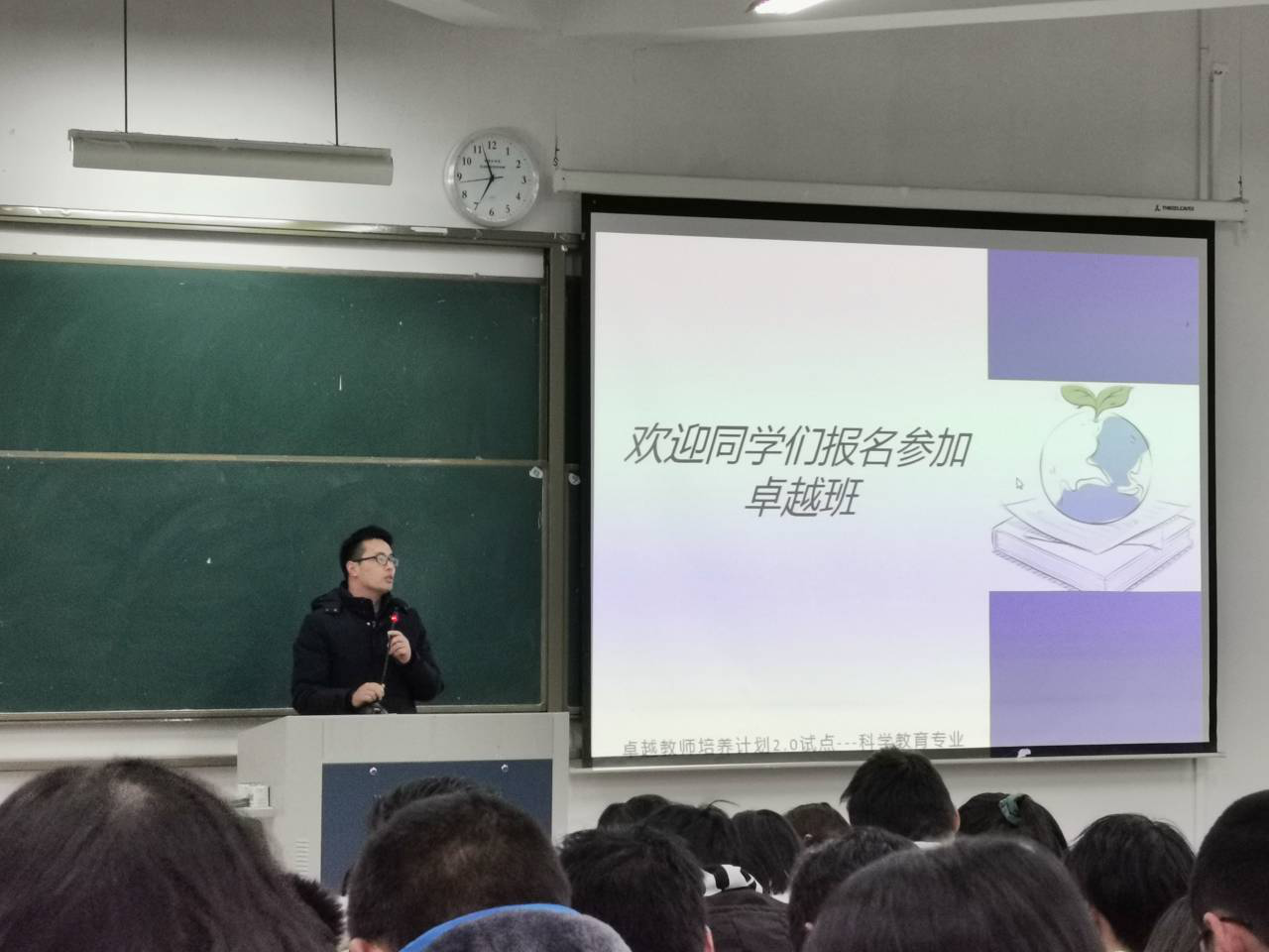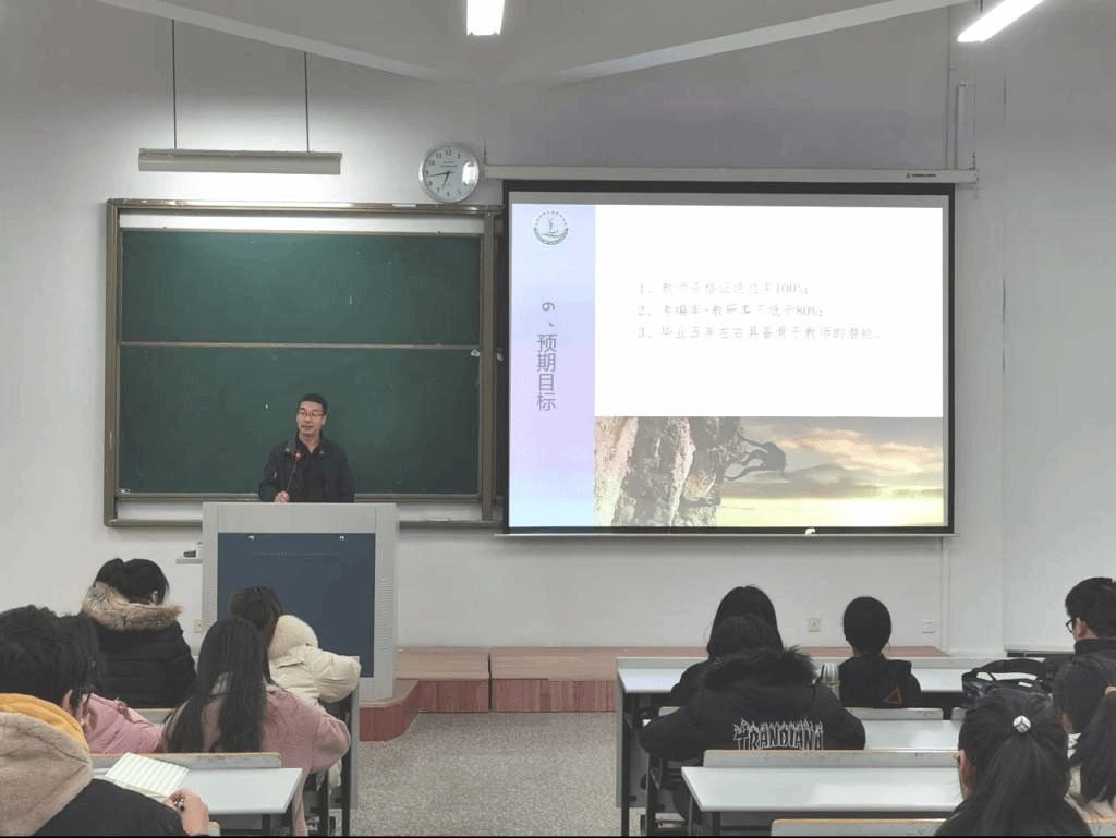 蒋胜韬副院长就卓越教师培养改革的意义进行了说明,并强调:1)作为师范生,对自己要有高标准、严要求,充分利用大学阶段的各种学习资源来充实自己的生活,丰富自己的学习,锻炼自己的技能,拓宽自己的视野,提升自己的素质,为将来的就业做好准备;2)要把握卓越班改革2.0改革试点的机会,争取进入卓越班学习,进一步提升自己的综合能力,为将来成为科学教育的教学骨干和教学名师奠定扎实的基础;3)不管是否能进入卓越班学习,都要保持积极向上的学习态度,一往直前的学习劲头。