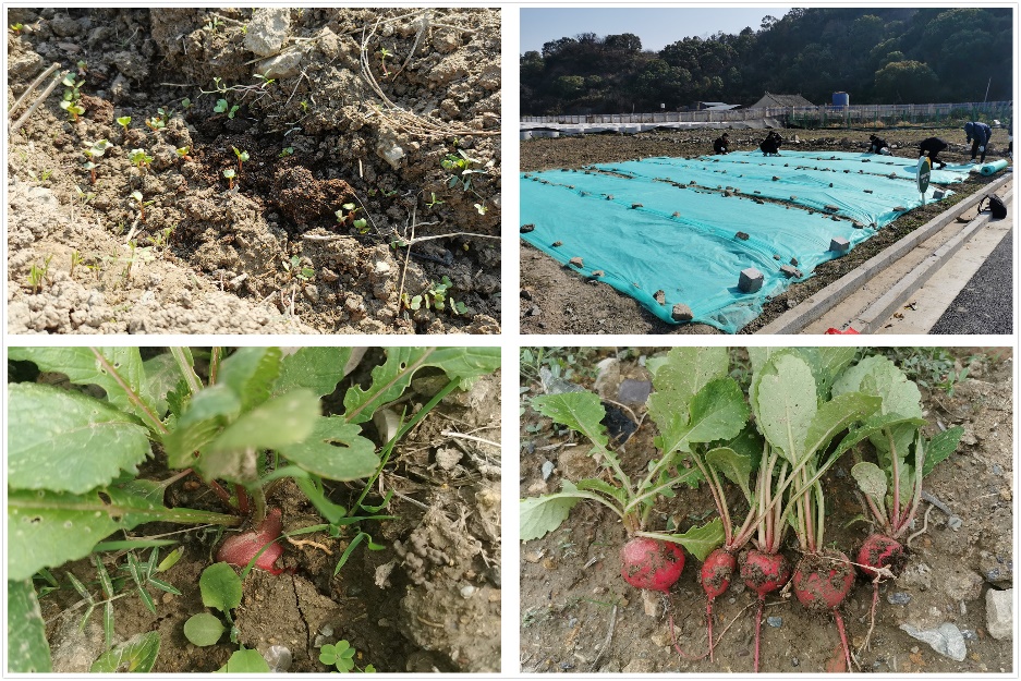 学院精心策划劳育活动方案,充分利用专业优势,聘请基础生物实验室主任陈彤老师担任垦荒活动指导老师。学院团学会学生干部带头,作为第一批“垦荒队员”,从去年11月起,在校园垦荒田上开始垦荒劳动实践活动;生物科学专业学生党支部在此开展“扬垦荒精神,感劳动光荣”主题党日活动,大家挖石块、翻地、清理杂草,为耕种前期做好准备,期间共计300余名志愿者参与。12月19日,学生志愿者顶着寒风,挖坑、堆肥、播种、覆土、浇水,将种子分区域种下,各个班级轮流进行每日浇水;正值寒冬腊月,为防止刚冒绿的小苗被冻坏,同学们抢在寒潮来临前为小苗覆膜保温,最终顺利渡过寒潮期。在同学们的悉心照顾下,今年开学初有幸收获了一批樱桃萝卜。