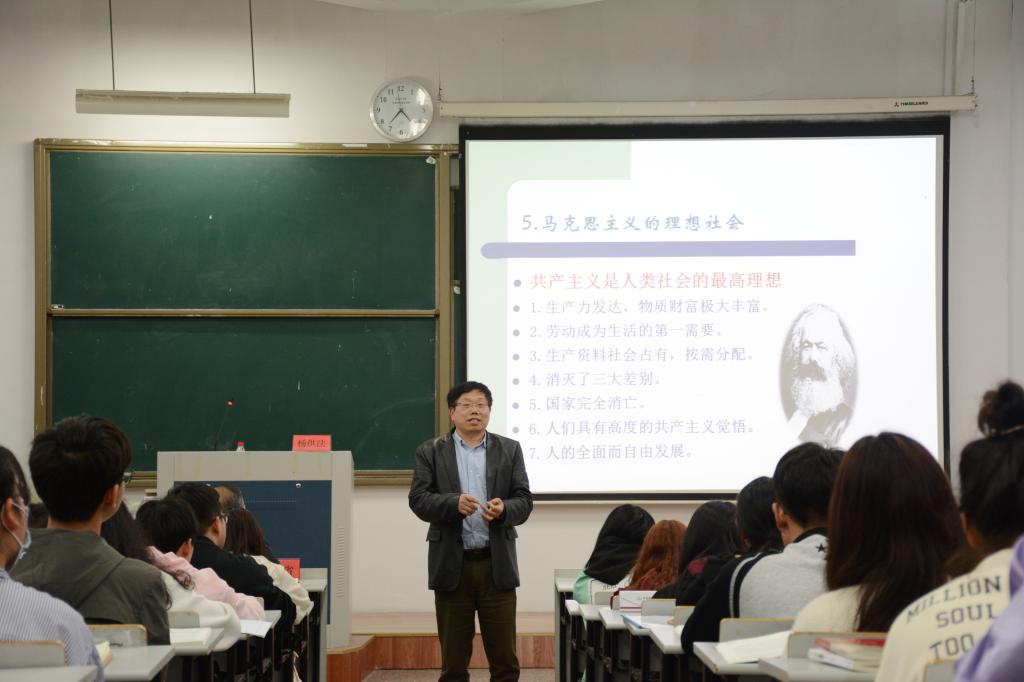 杨供法以“小资”“BOBO族”“IF”一族等各个新兴的社会阶级引题,从“生活只是眼前的苟且”讲述个人生活理想的不同层面,从“生活不只是眼前的苟且”阐释社会理想的深远意义,从“诗和远方的田野”进一步剖析要将个人理想融入到崇高的社会理想当中,强调马克思主义的理想社会中共产主义是人类社会的最高理想。最后,他辩证地分析理想与现实的关系,指明社会是航船,历史是长河,理想是灯塔,勉励大家要把个人理想与社会理想结合起来,把远大理想与现实任务统一起来,牢牢把握社会主义初级阶段的基本国情,争做坚定有为的青年马克思主义者。