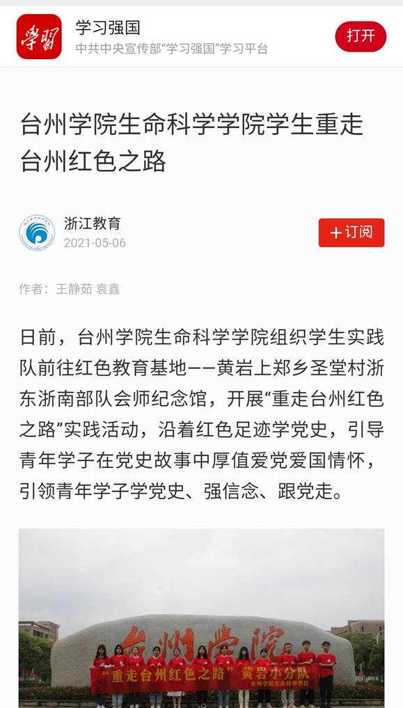日前,台州学院生命科学学院组织学生实践队前往红色教育基地——黄岩上郑乡圣堂村浙东浙南部队会师纪念馆,开展“重走台州红色之路”实践活动,沿着红色足迹学党史,引导青年学子在党史故事中厚值爱党爱国情怀,引领青年学子学党史、强信念、跟党走。