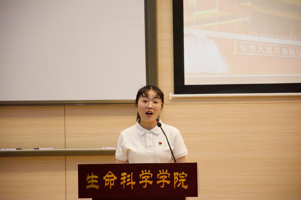 2017级科学教育1、2班的陈晓榕代表毕业生党员发言,她表示,作为新时代的新党员,我们生逢盛世却也肩负重任,“一个党员一盏灯,一名党员一面旗”,是灯就要闪亮,是旗就要招展,要坚定信念,争做有理想、有本领、有担当的新时代青年。